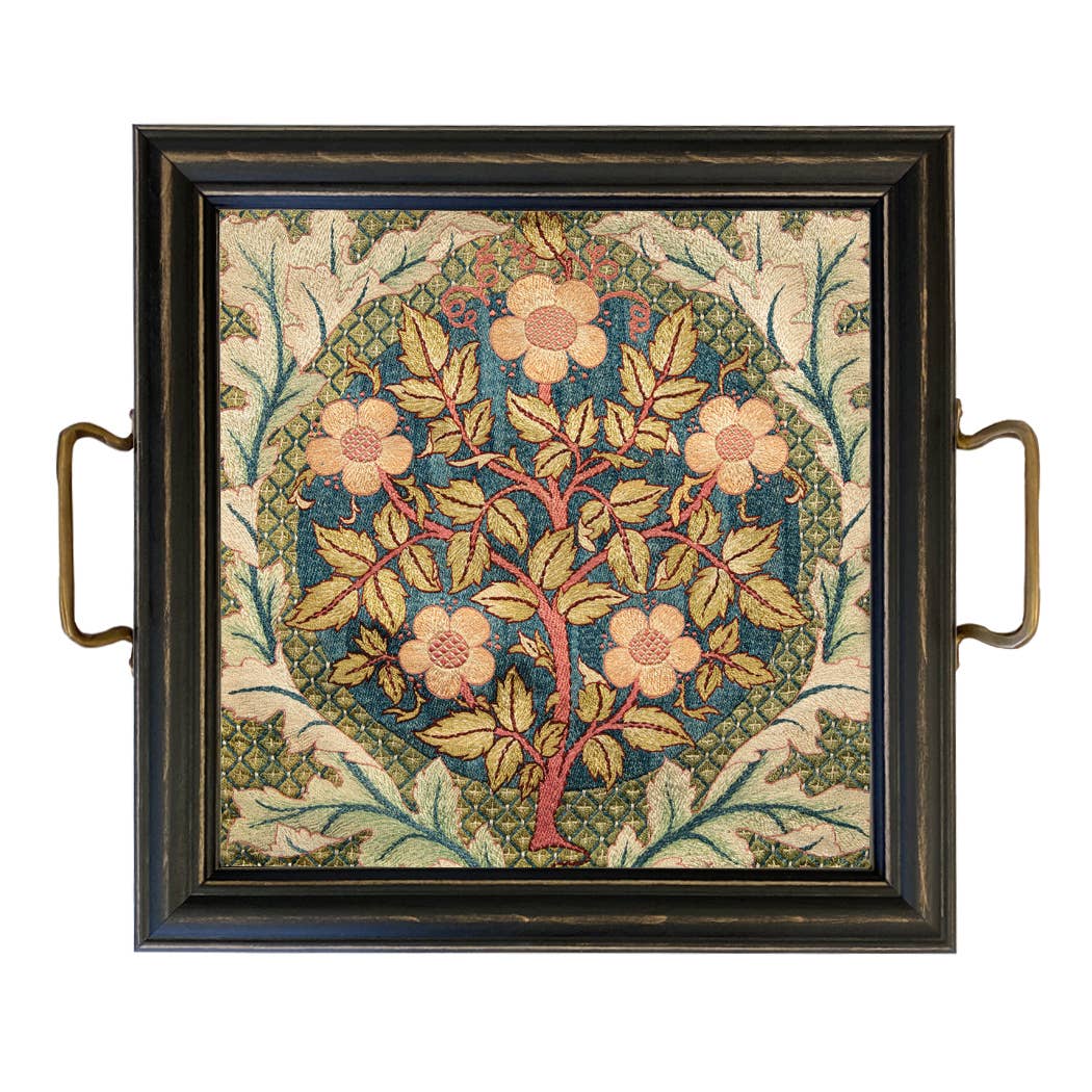 This distressed wood framed decorative tray is beautifully finished with our print of William Morris's embroidery design of a flowering rose wreath. The tray is accented with antiqued brass handles. Four felt pads keep the tray stable on almost any surface. Use as a table top furniture accessory or for board or card game accessories at home or cabin.