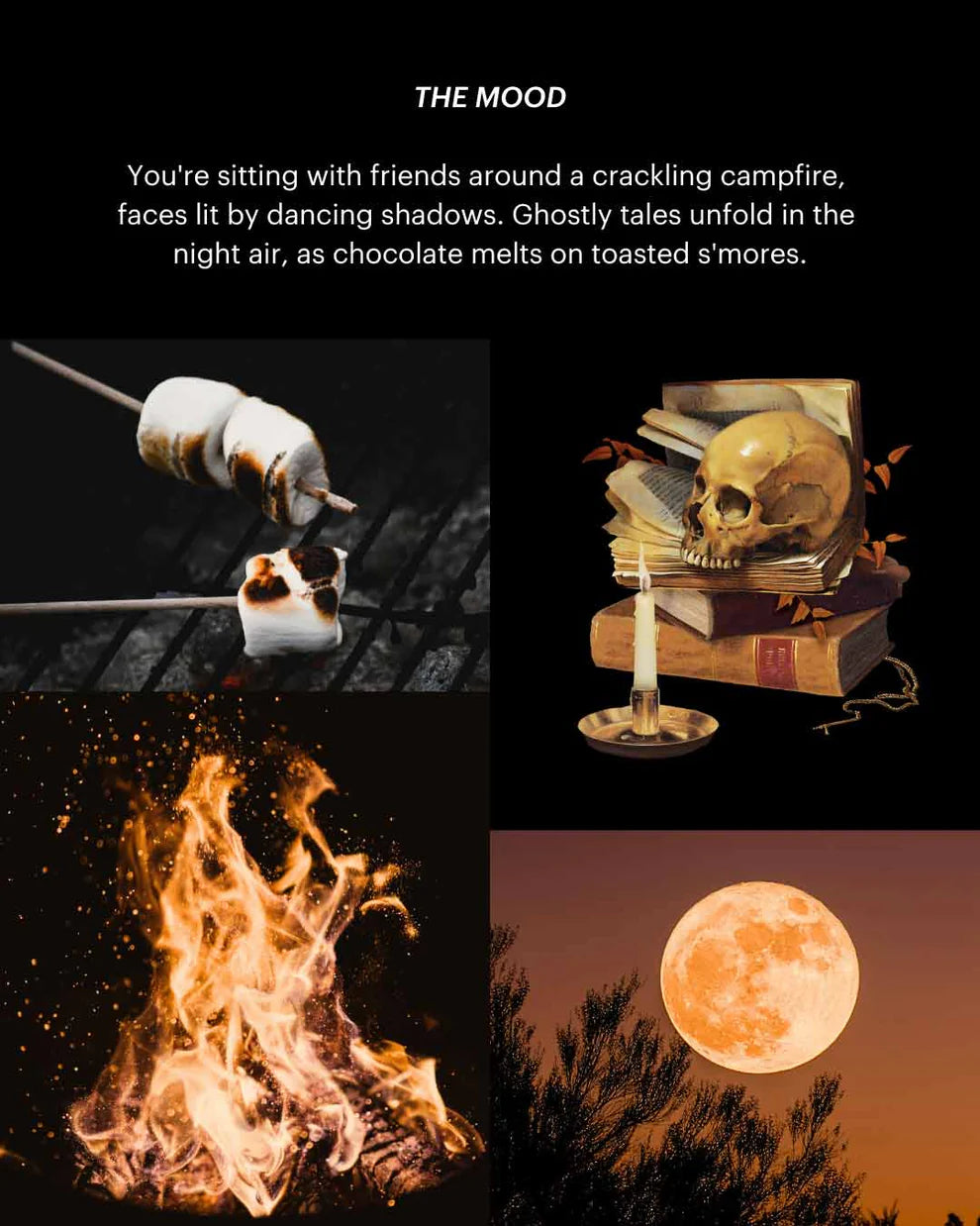 You're sitting with friends with friends around a crackling campfire, faces lit by dancing shadows. Ghostly tales unfold in the night air, as chocolate melts on toasted s'mores. Notes of woodsmoke, citrus, dark chocolate & mahogany fill the air.