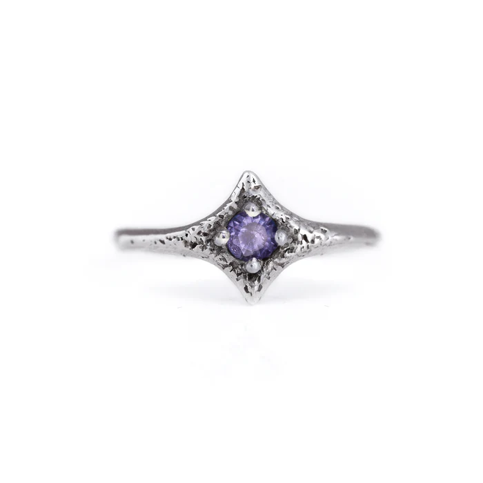 A dainty yet mischievous treasure, the Amethyst Pixie Ring is crafted using the cast-in-place method, where the gemstone is set directly into the wax before casting. Each piece is hand-textured by Lily Streeter, ensuring that no two rings are ever exactly alike.