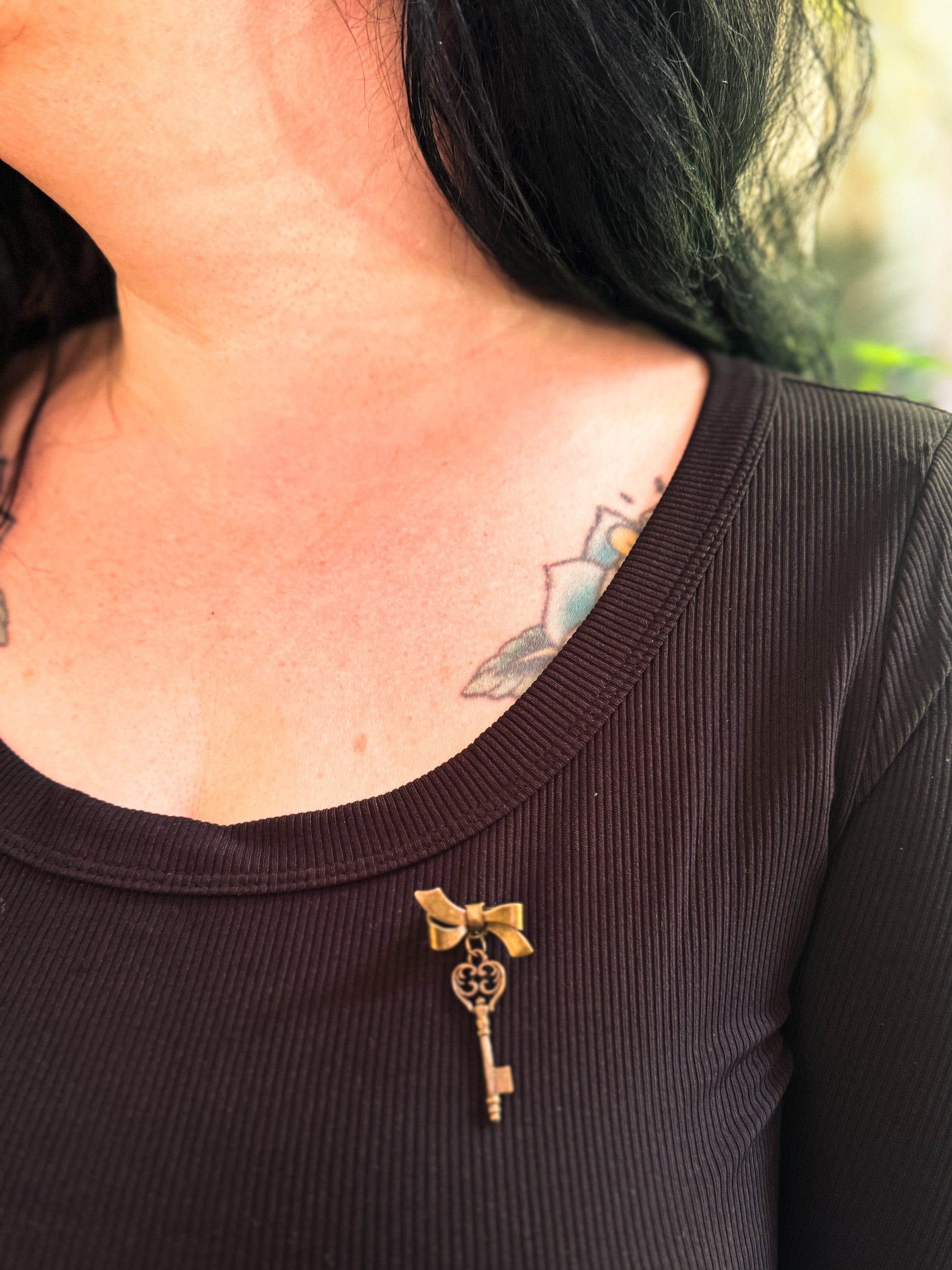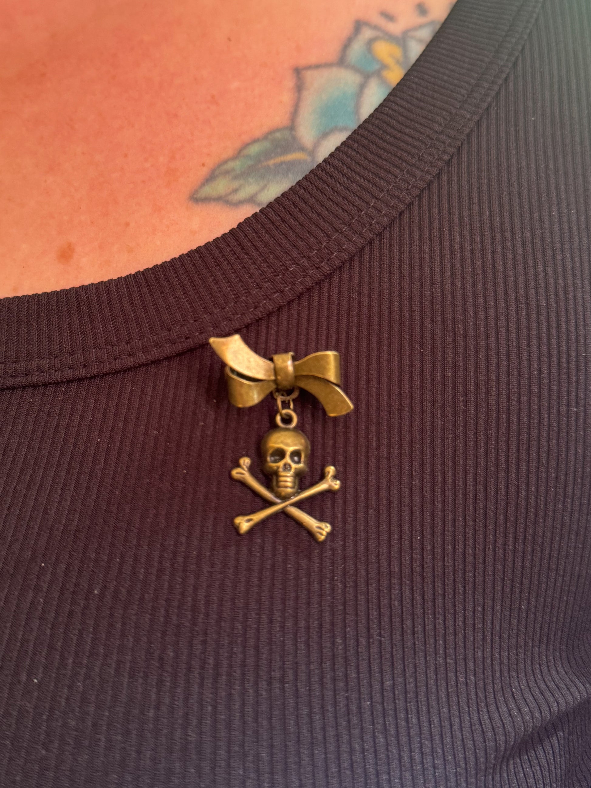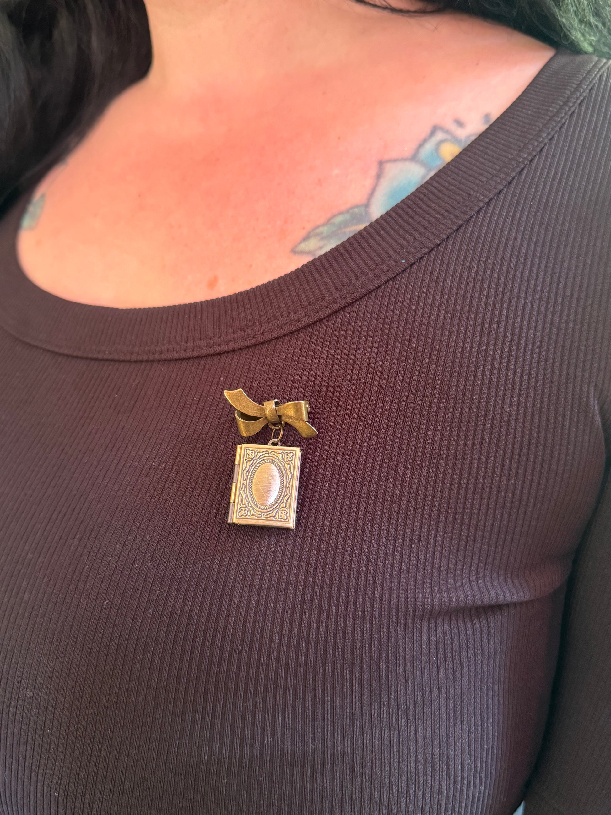 Charmed, I am sure! Enjoy the ever so charming Antiqued Bronze Victorian Brooch Collection by Hagvvitch. Unlock a charming accessory with each piece adorned with a sweet bow and your choice of a skeleton key, skull and crossbones or book locket. Fashion meets lit in this unique and playful collection.