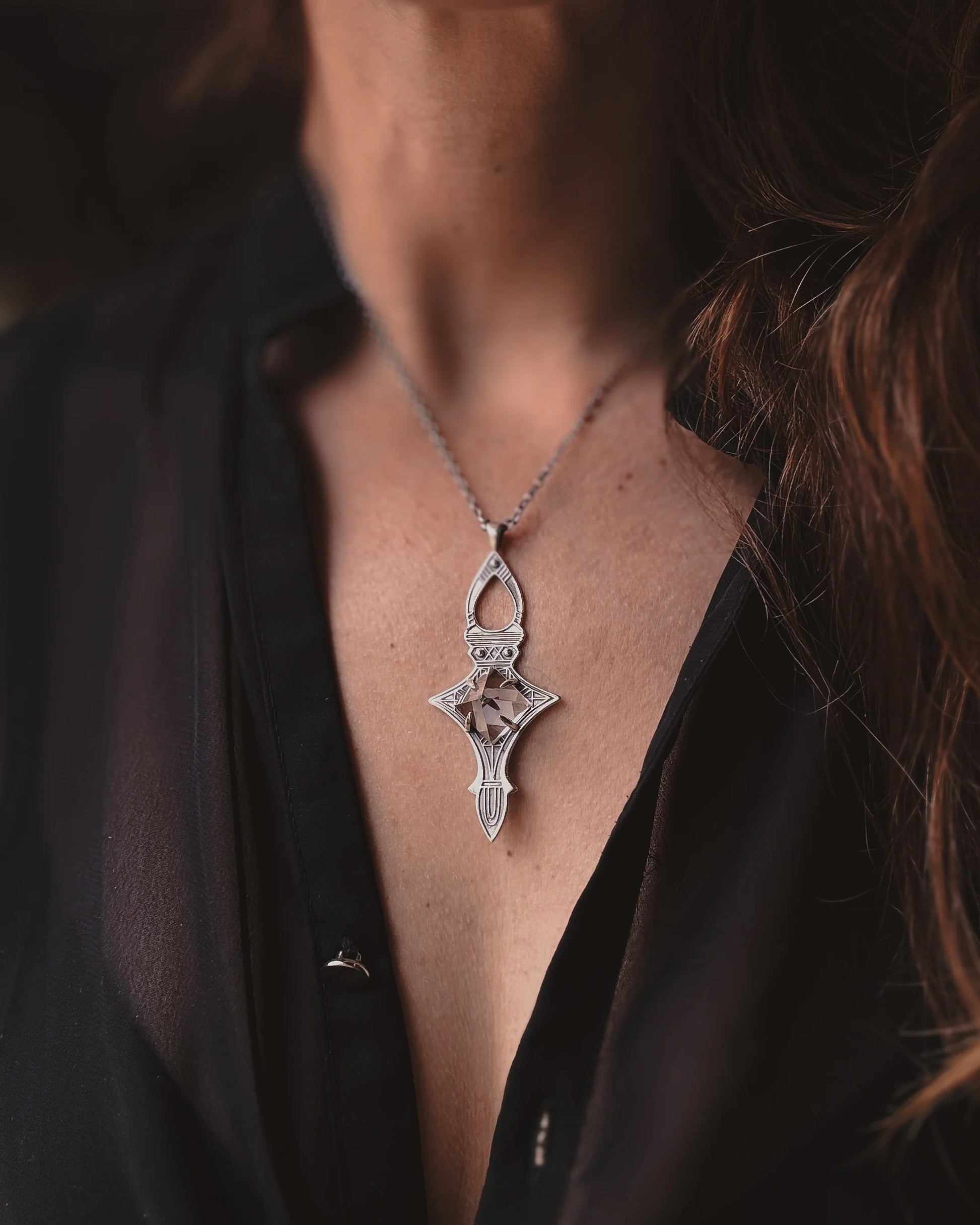 Handcrafted in sterling silver with etched line work that echoes the energy patterns of ley lines and natural geometric forms, this striking piece embodies the intersection of ancient wisdom and cosmic consciousness. The pyramid form has been revered across cultures as a conduit for spiritual energy, while the surrounding geometric framework creates a protective boundary that focuses and directs this powerful force. With subtle nods to traditional protective jewelry including Tuareg designs, this necklace serves as both shield and beacon for modern spiritual travelers.