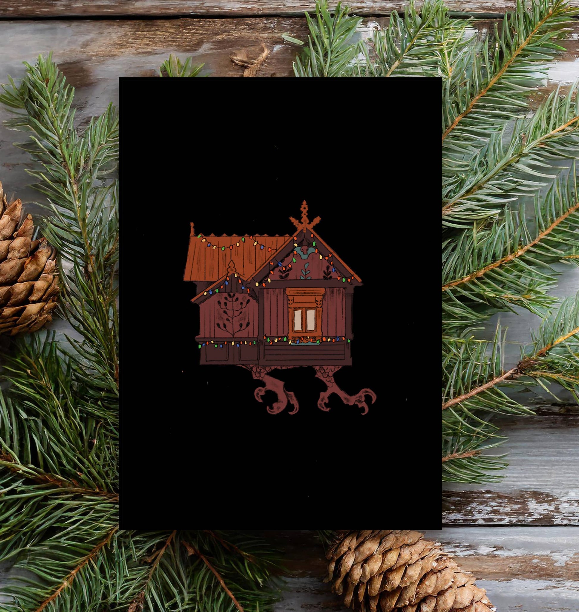 Baba Yaga's house all decorated for the season! Card is blank on the inside.