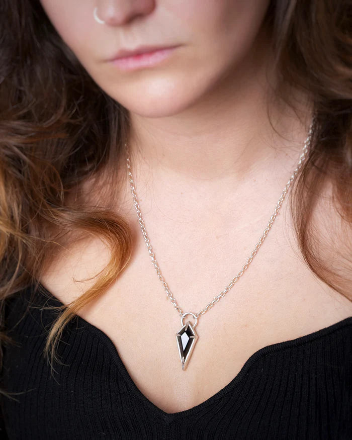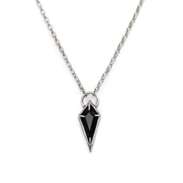 This striking pendant features a hand-cut black onyx gemstone, its faceted form echoing the shape of a medieval shield. Known as the stone of protection, black onyx is believed to absorb and deflect negative energy, making this piece both adornment and talisman.