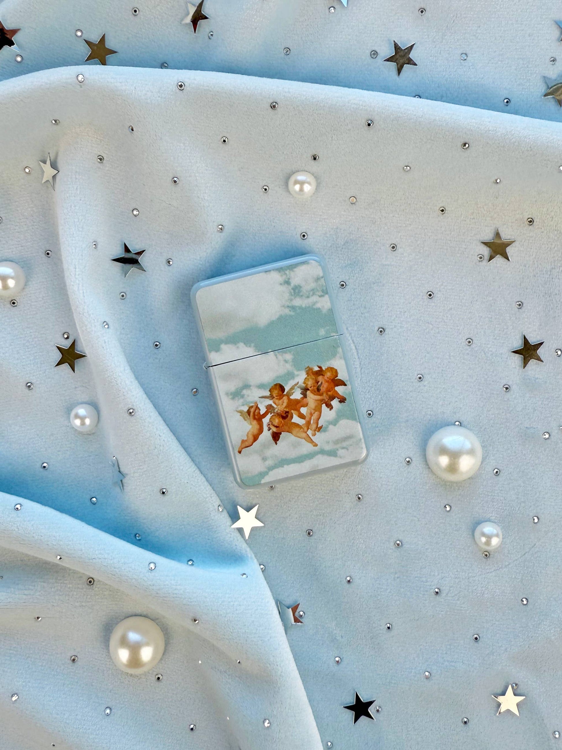 This light blue lighter features cute little cherubs whimsically flying in the sky. Perfect for lighting cigarettes, candles, or whatever else you need a fire for!