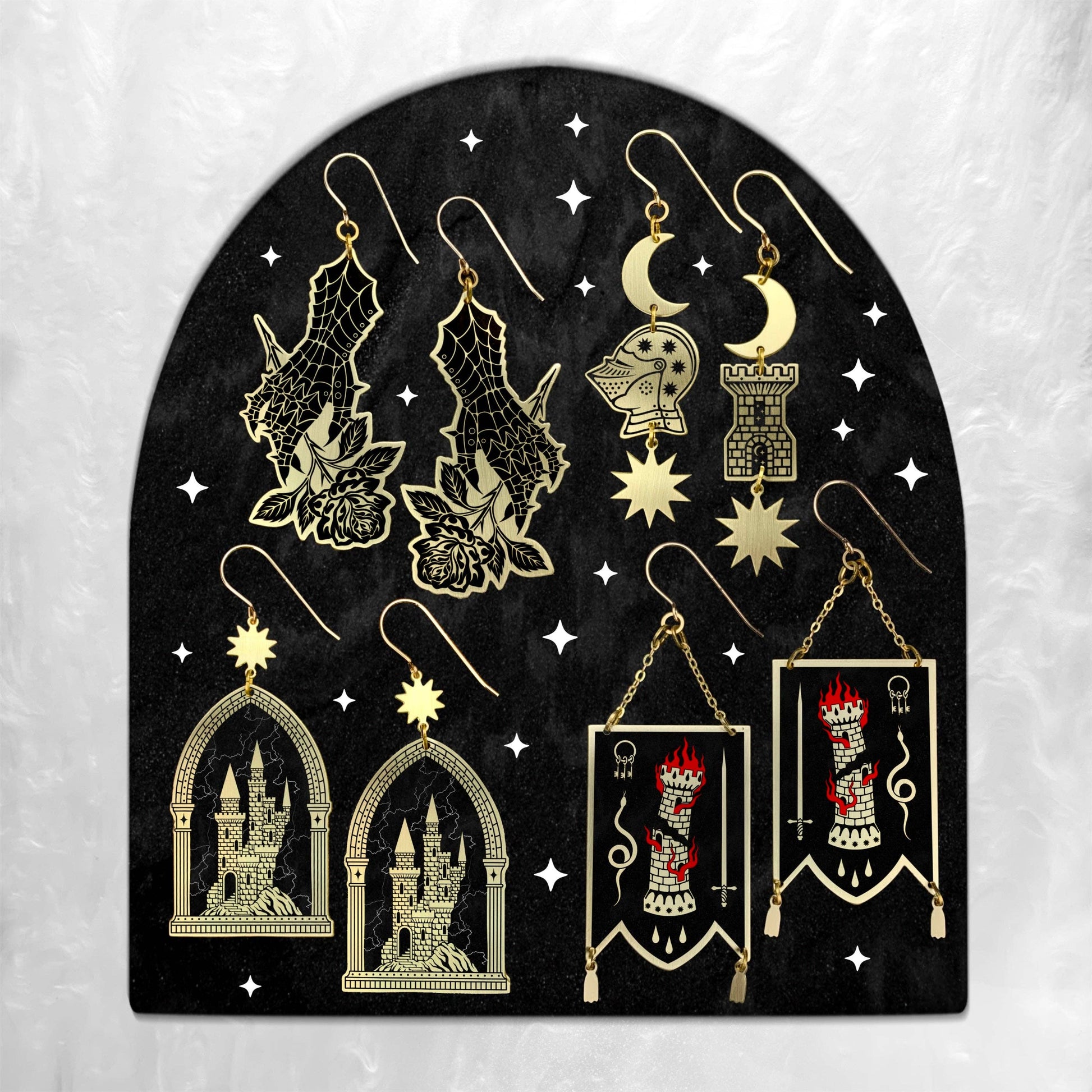 Brass earrings come with gold-filled hooks. Dimensions: 2.5" tall Weight(per earring): 0.23oz Care: These are coated to protect the metal, keep them from oxidizing and making them easy to clean. The glossy black details are very durable, making these the ultimate low-maintenance statement earrings!
