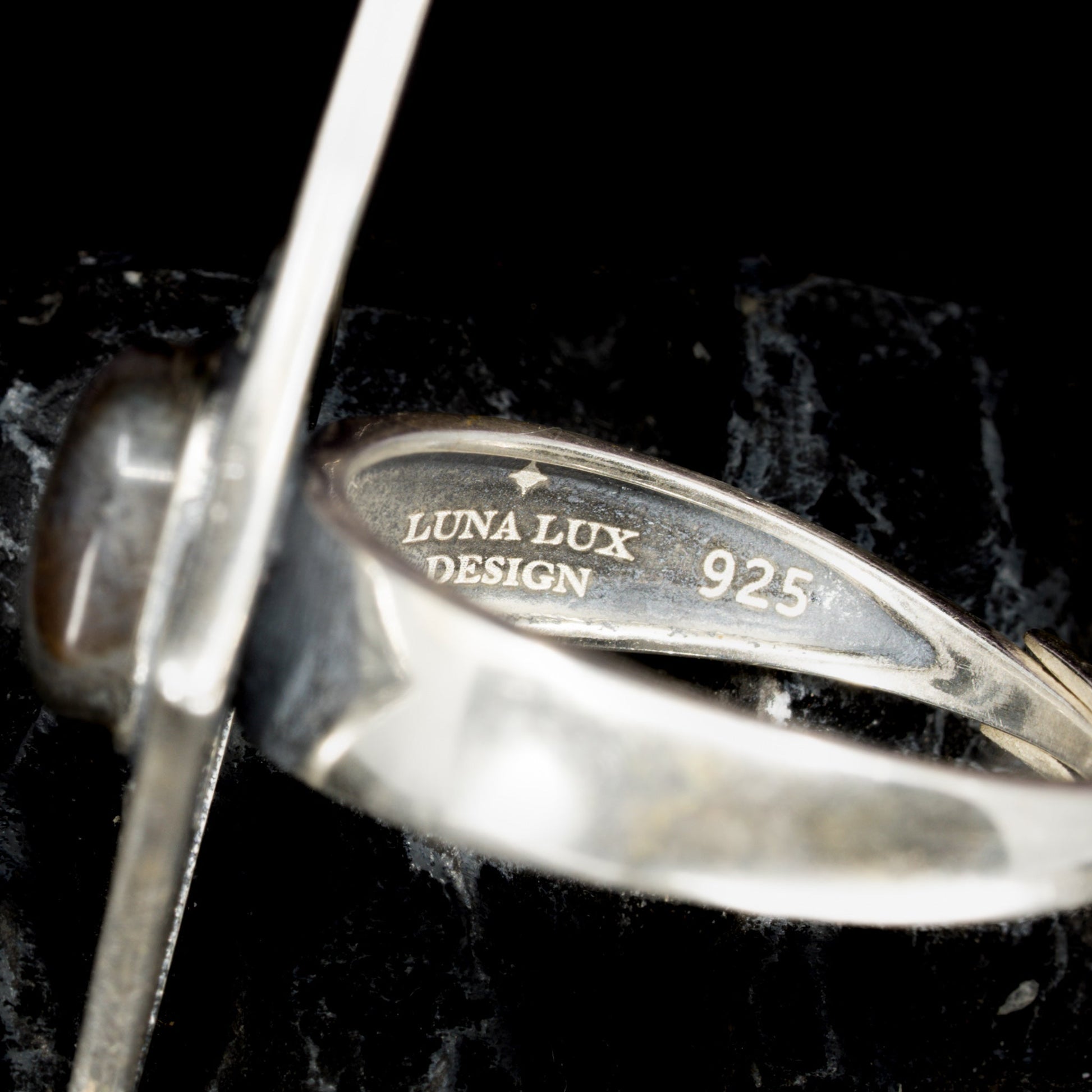 This design showcases an oval Labradorite set in a sterling silver bezel. Its distinctive shape and style boasts an elongated diamond silhouette, complemented by intricate beading and an adjustable band for effortless wear.