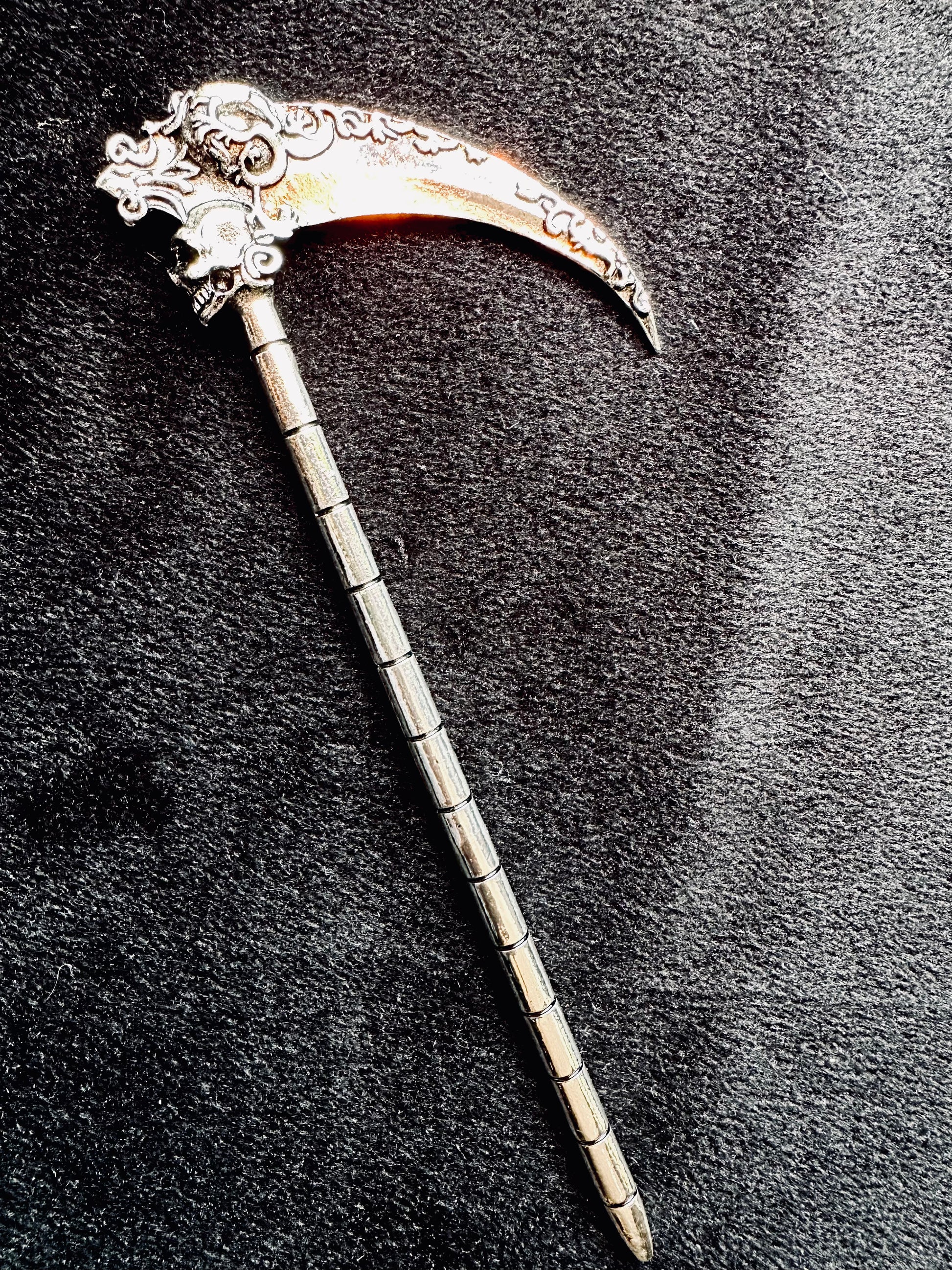 Don’t fear the reaper! This dark silver hair accessory features a unique design of skull and filigree along a menacing scythe, perfect for adding a touch of harvest season horror vibes to any hairstyle. Whether used as a classic hair stick or a unique adornment, get creative with your hair looks!