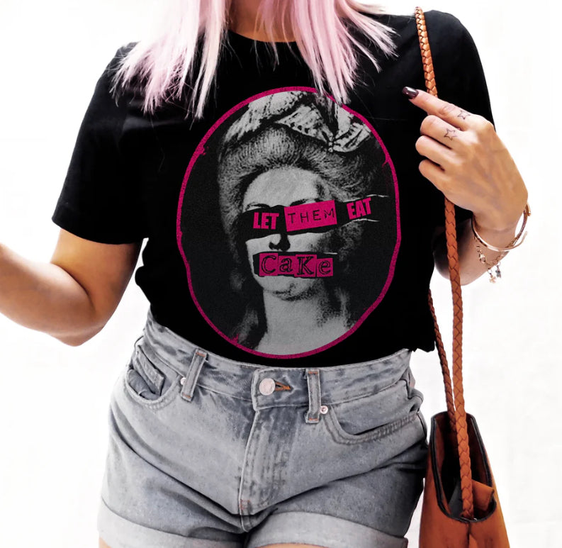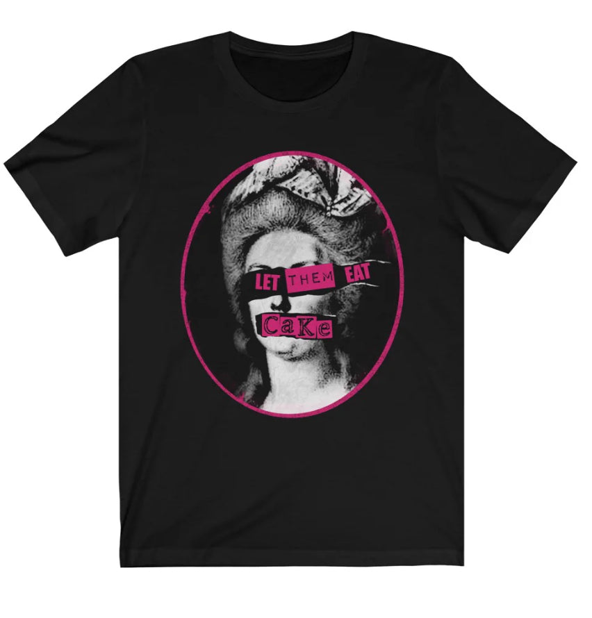 Discover the Let Them Eat Cake t-shirt, an essential for any enthusiast of dark history. The infamous quote, "Let them eat cake," is credited to Marie-Antoinette, the former queen of France during the turbulent French Revolution. Legend has it that she uttered these words upon hearing of her starving peasant subjects. With its elevated price tag, cake serves as a symbol of the queen's detachment from the struggles of the common people. This one-of-a-kind design is brought to you by the skilled Natalie Linaweaver of Wonder Witch Boutique.
