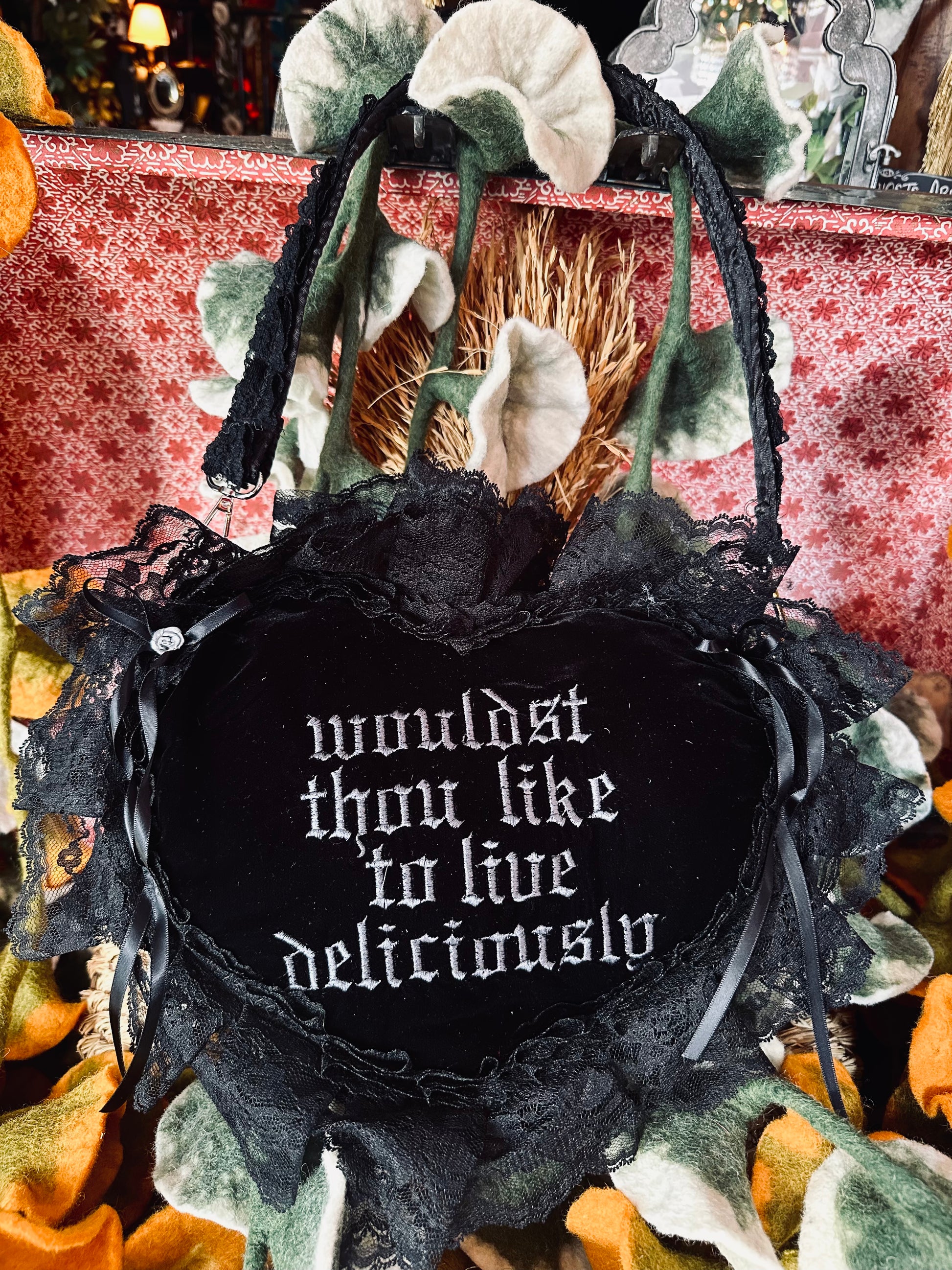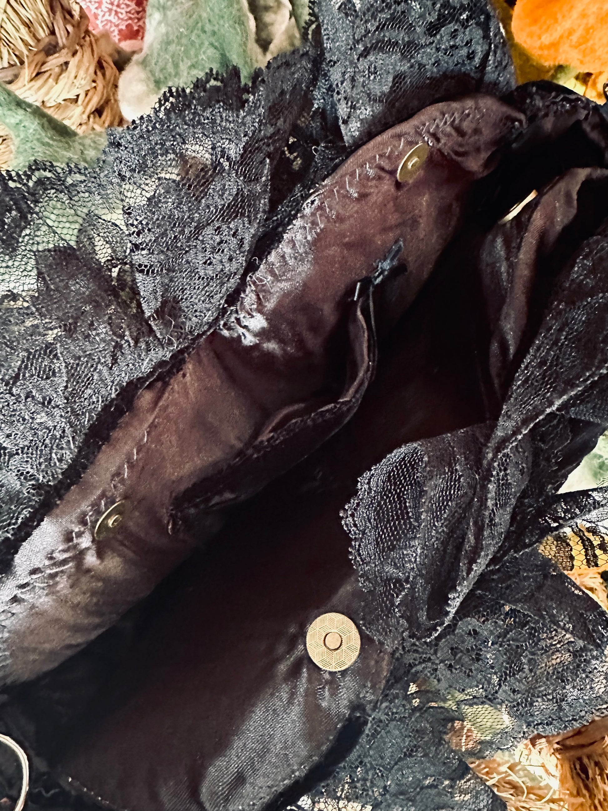 Cushiony black velvet & extravagant lace! Handmade using recycled and vintage materials by Dirty Pillows. Purse has snap closures and a velvet inner pocket.