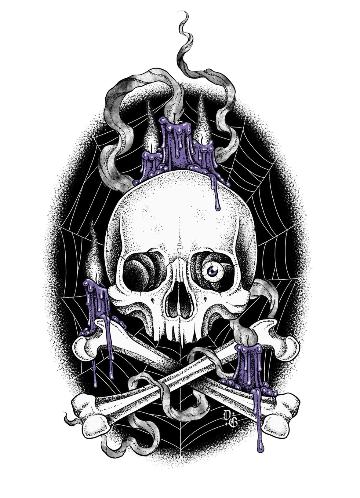 Dana Glover is an illustrator and tattoo artist based in Salem, Massachusetts, but born and raised in a suburb just north of New York City. Having grown up near a small graveyard just through the woods behind her childhood home, Dana found solace there, but became fascinated by death in the natural cycle. Dana's illustrations and tattoos are inspired by 17th century New England + 19th century garden-style cemetery iconography, Victorian mourning ephemera, the Golden Age of Illustration, occult subjects, vintage Halloween imagery, and goth subculture.