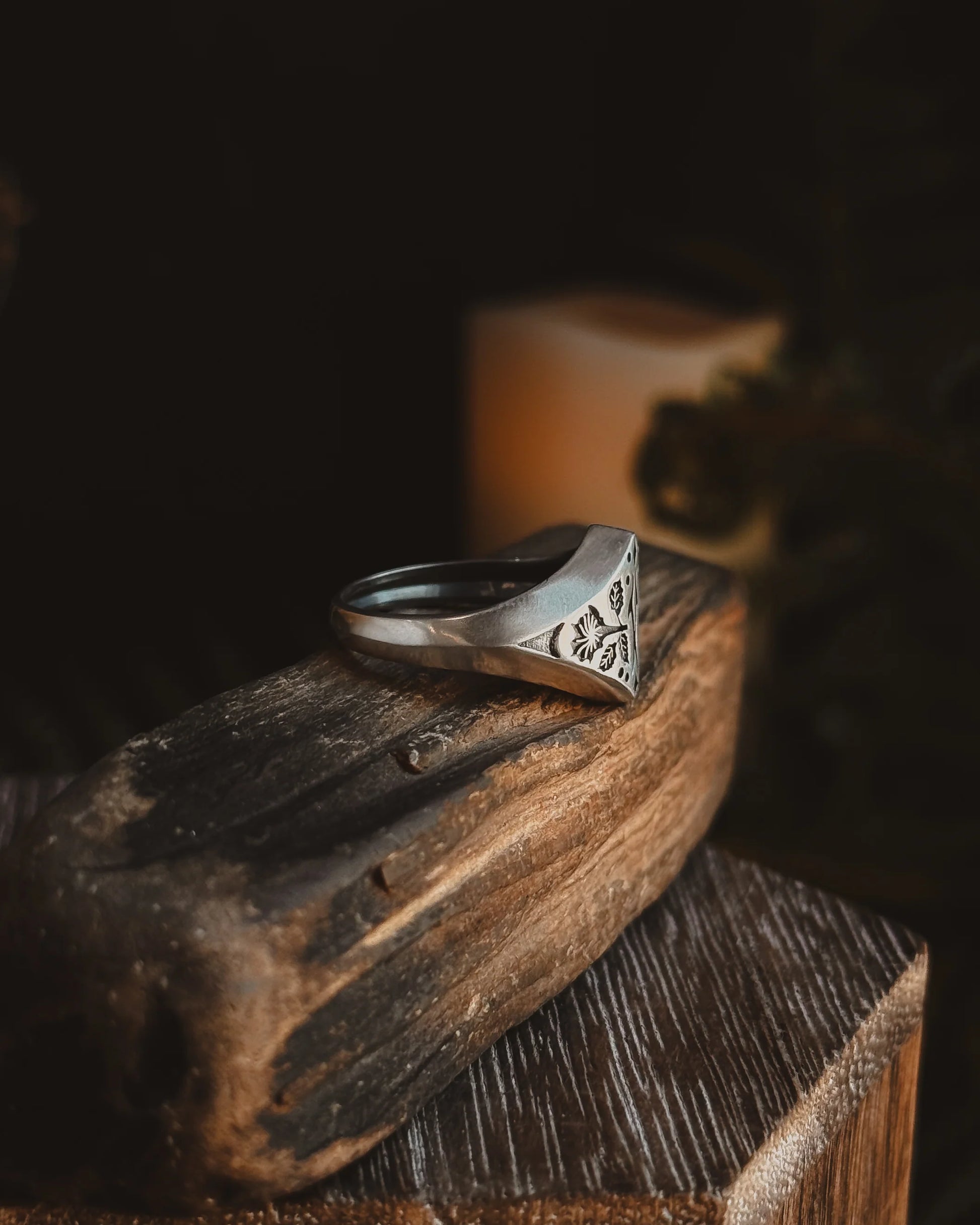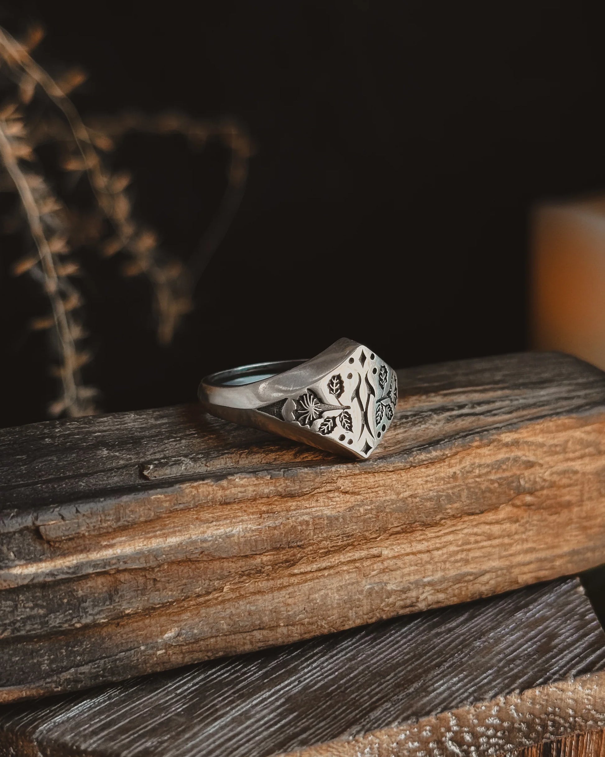 Hand-carved sterling silver signet ring featuring hand-drawn datura illustration.