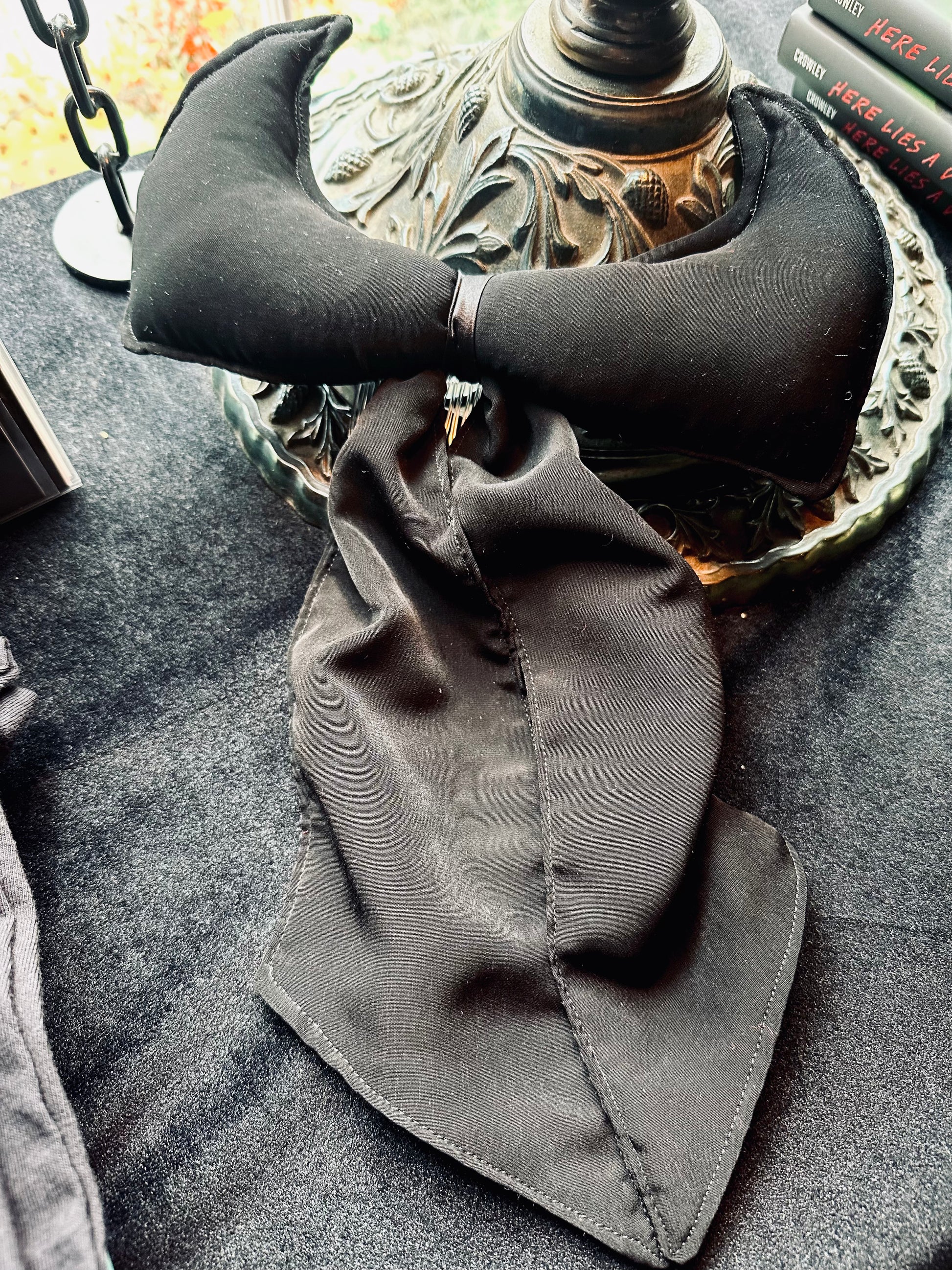 Handmade by Dirty Pillows. There's a little devil inside all of us, no matter how sweet we appear. This is an oversized hair bow that when worn, the little horns peak up above your head! I love these bows so much! So cute! These are made with a satin or velvet fabric; the inside has a strong interfacing in the core that allows the bow to curve slightly and fit against the head. There is also a light wire placed at the bottom of the base of the bow, allowing the wearer to curve the inside in a bit more. For extra reassurance that it will stay in place, pins can be worn with the bow (I don't have any pins in for these photos) The horns are stuffed slightly to give structure and the signature pillow effect.
