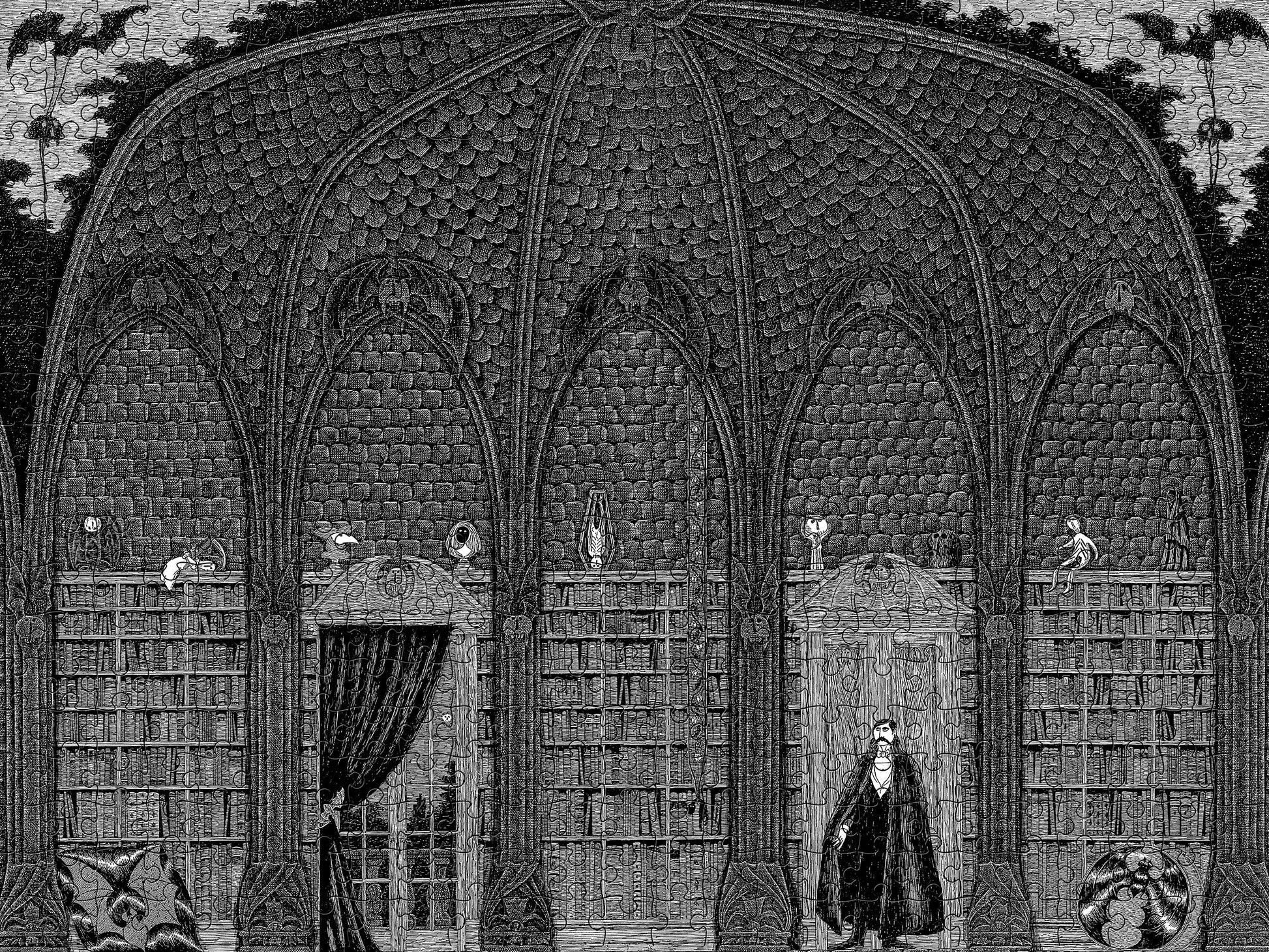 Edward Gorey (American, 1925–2000) Dracula in Dr. Seward’s Library Author and illustrator Edward Gorey was also was a set and costume designer for innumerable theater productions from Cape Cod to Broadway, including a celebrated staging of Bram Stoker’s Dracula, for which he was awarded a Tony. One of Gorey’s stage designs for the play is reproduced for this 500-piece puzzle, giving you the opportunity to study his exquisite cross-hatched drawing technique up close.