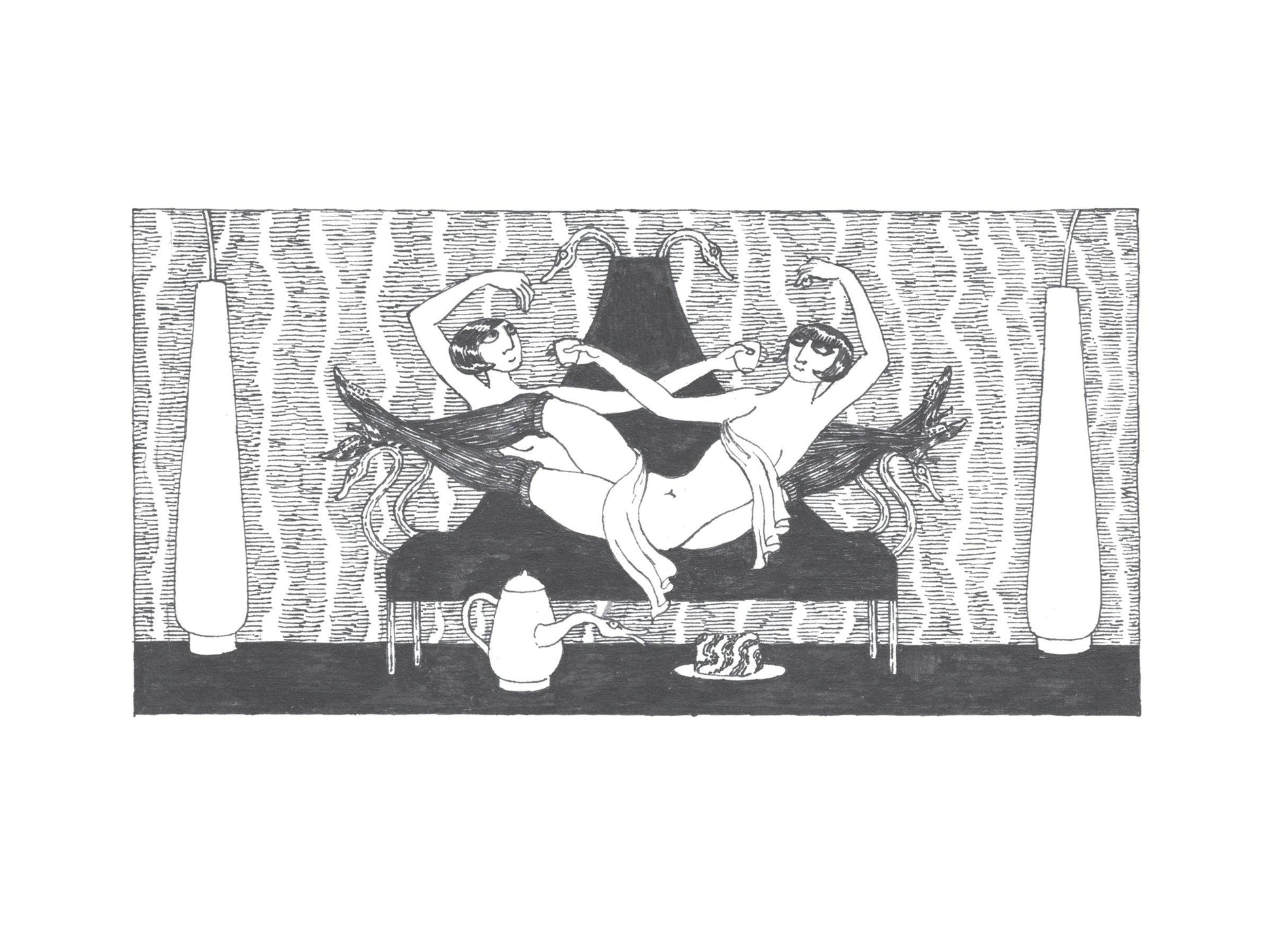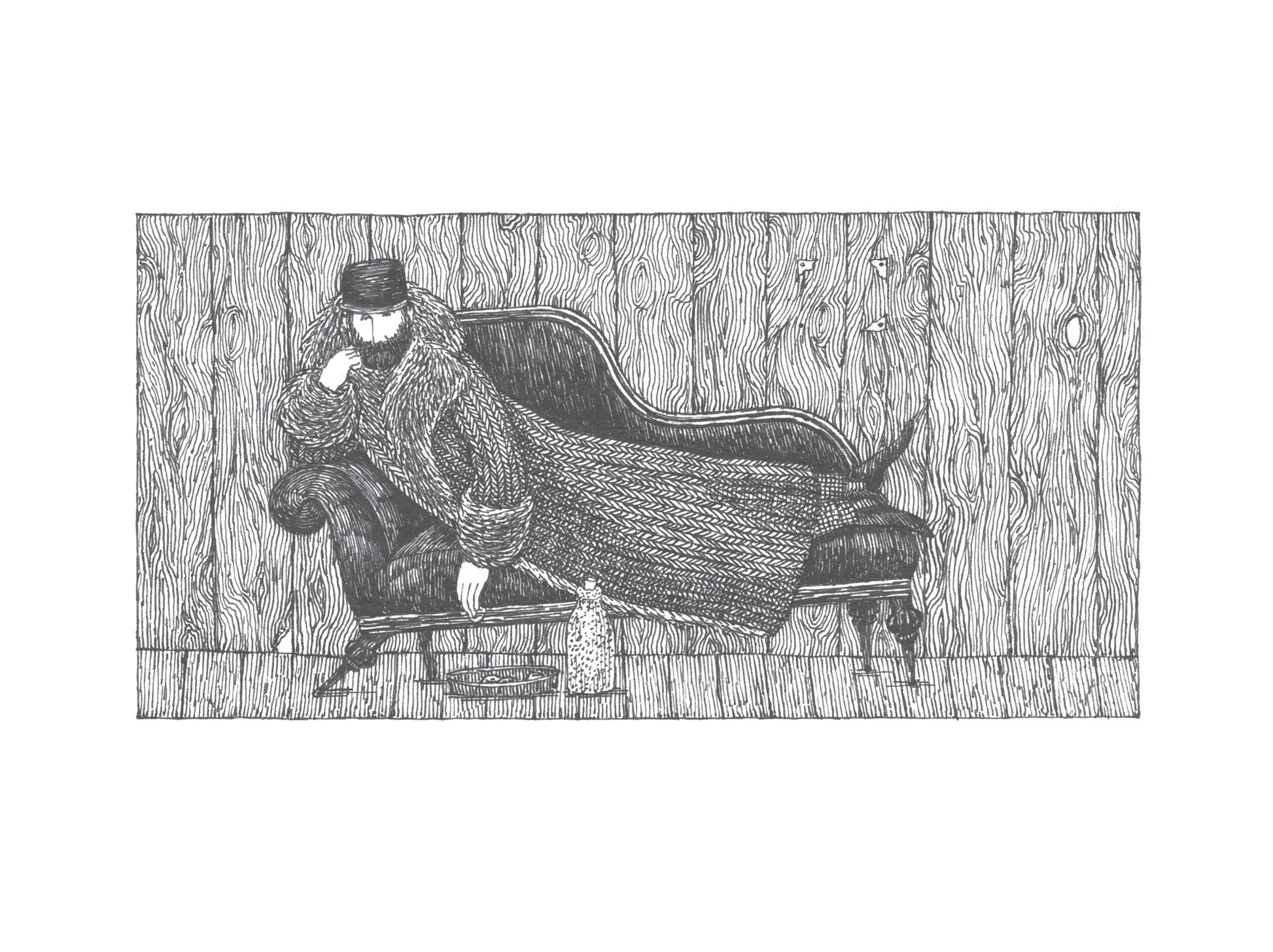 In The Fraught Settee, Edward Gorey serves what he calls “the universal solvent” in Edwardian parlors, where fainting couches host feverish affairs and fretful discontent. Knowing that Gorey had a penchant for nonsense verse, one wonders whether Q.R.V. is a cryptic cure-all or drivel of a dubious nature. The illusive concoction’s initials appear on the cover of the book, though its title does not. Published by Gorey’s Fantod Press in 1990, this collection of verse is as enigmatic as its creator.
