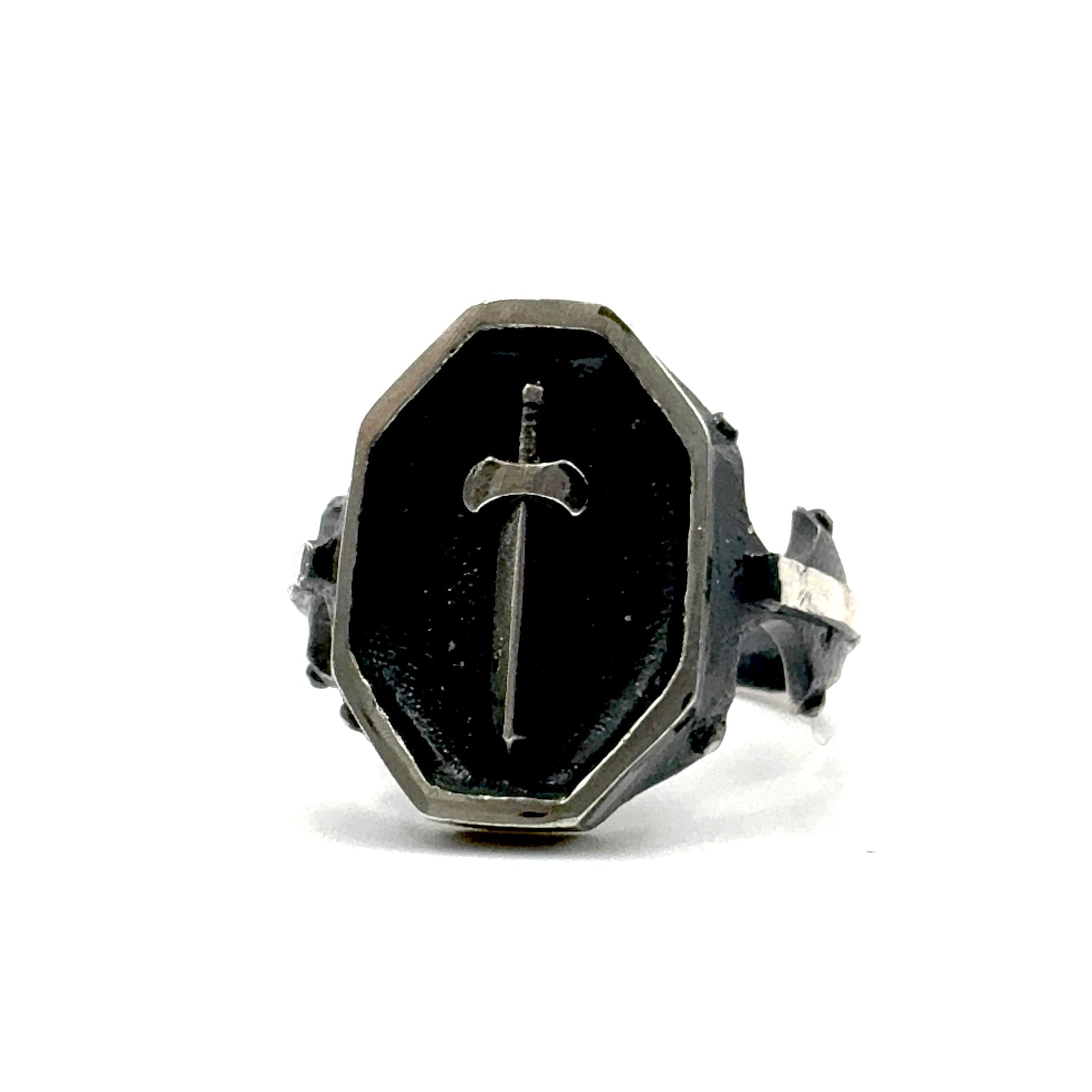 Whether you’re a lover of fantasy, a collector of unique jewelry, or simply someone seeking a piece that makes a statement, the Excalibur Signet Ring is destined for your next adventure. Oxidized dark to create stunning contrast, this piece will evolve as it's worn and will shine on the high points over time.