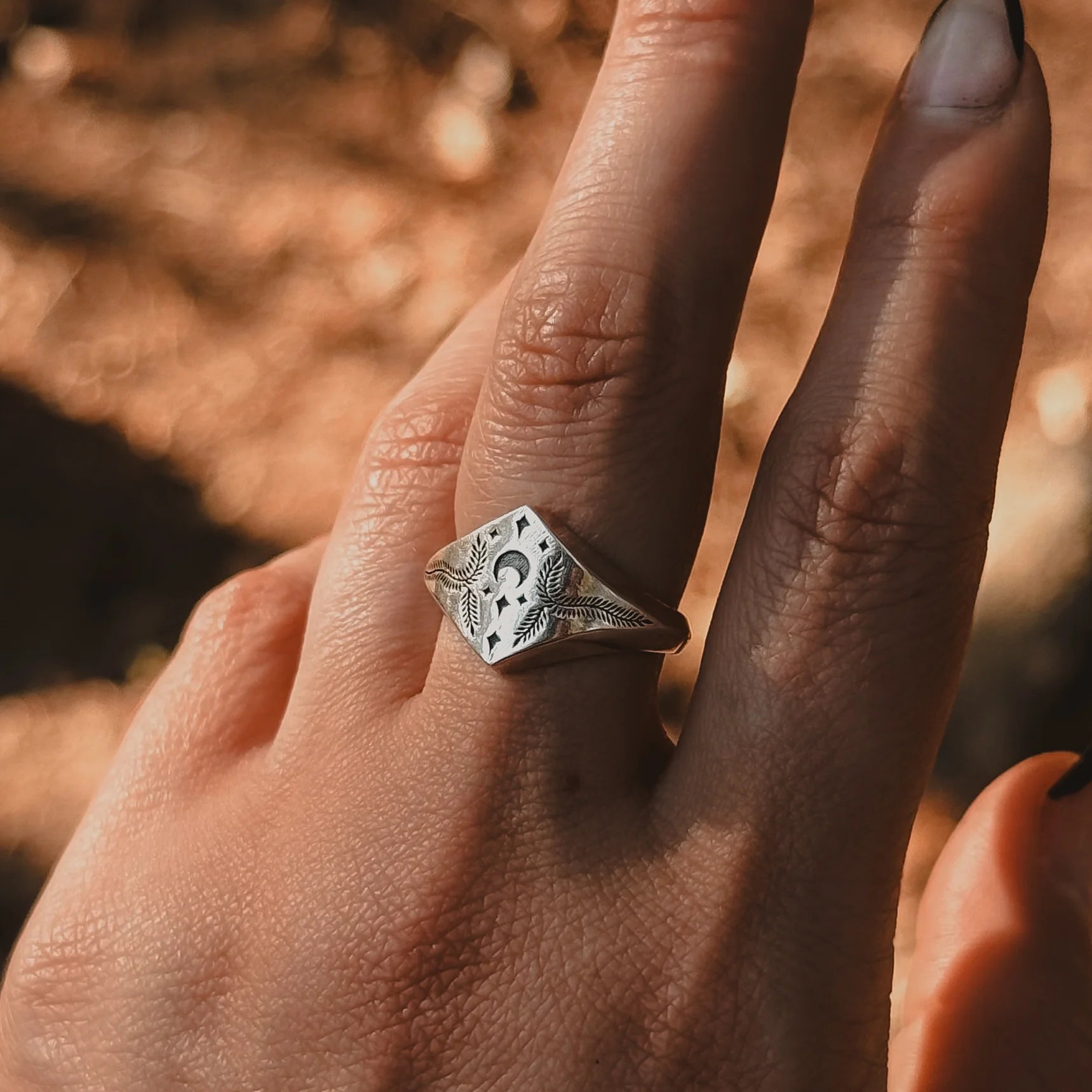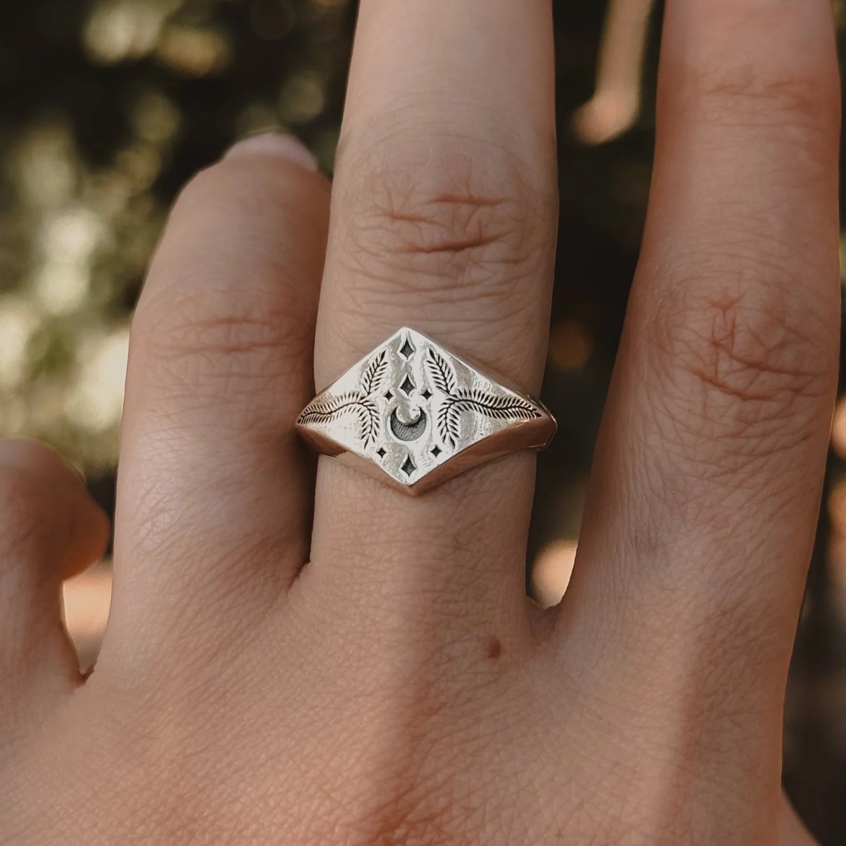 Hand-carved sterling silver signet ring featuring hand-drawn fern illustration.