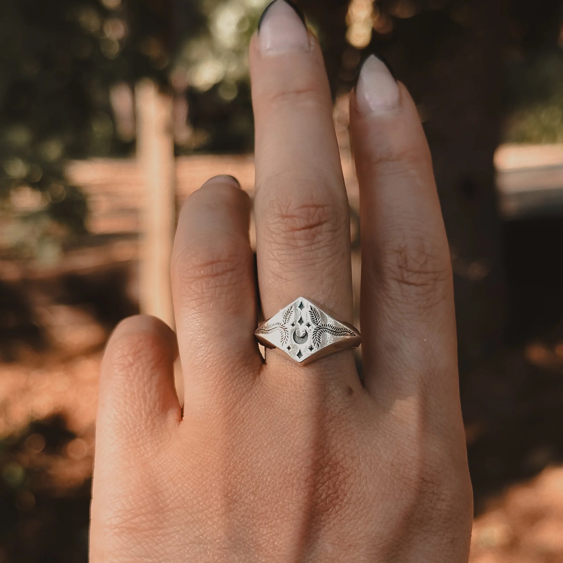 Wearing this fern signet ring creates a connection to these qualities, supporting you through periods of change while reminding you to remain grounded in peace and self-compassion. This talisman serves as a gentle reminder that growth, though sometimes challenging, always leads to greater beauty and wisdom.
