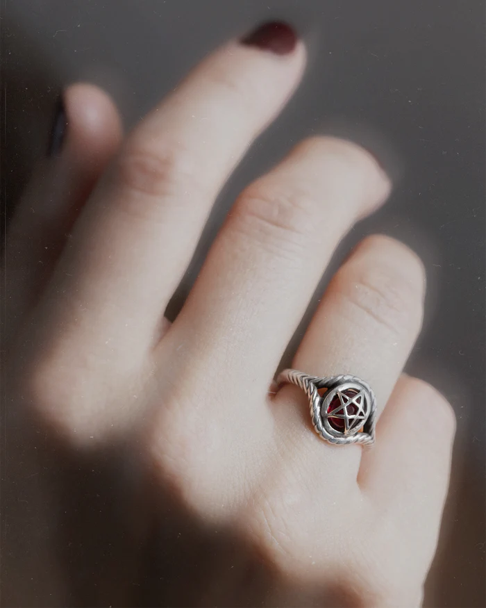 Step into timeless mystique with the Pagan Priestess Ring by Alex Streeter, an elegant fusion of nature and the occult. Handcrafted in sterling silver and set with a fiery garnet gemstone, this piece channels the strength and mystery of ancient priestesses.