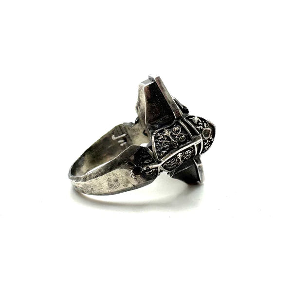 Green Knight Ring with chrome chalcedony and orissa garnet in Sterling Silver is a one of a kind set with this gorgeous stone. This ring is a symbol of courage and loyalty, inspired by the legend of the Green Knight.
