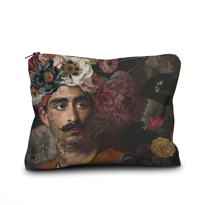 The Hassan Velvet Pouch from French artist, Voglio Bene. The designer illustrates with an aesthetic blend of street art and art history to create unique, colorful and iconic characters. All of Voglio’s designs are printed on eco-friendly materials. Pouch measures 17x23cm.