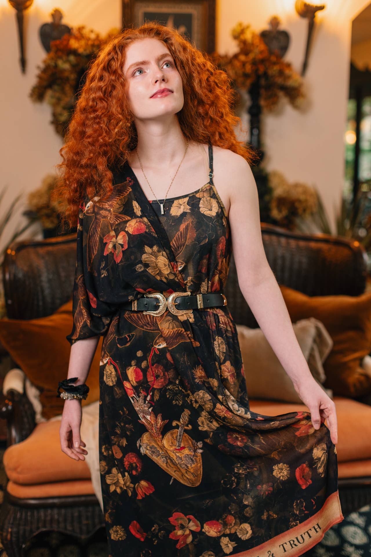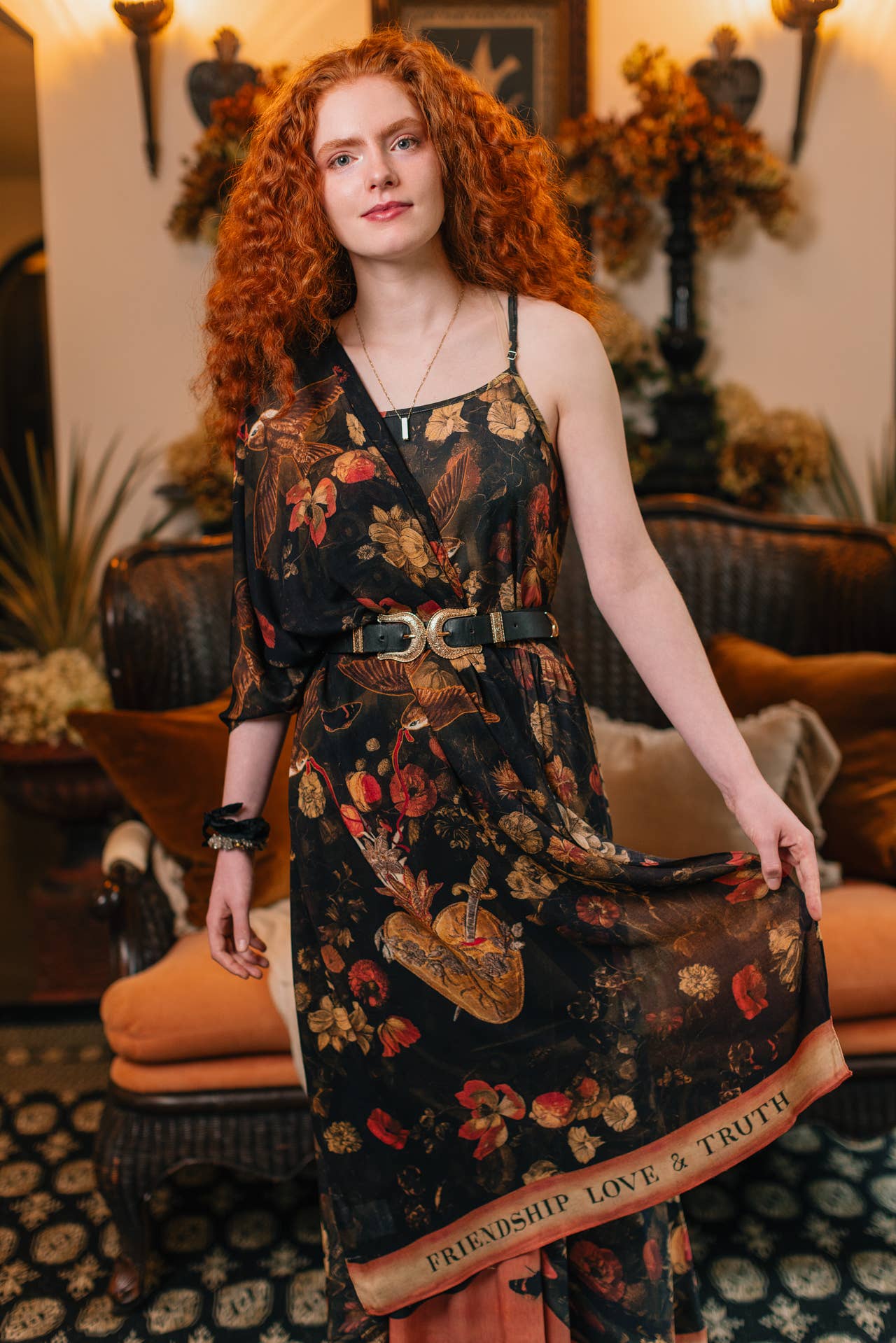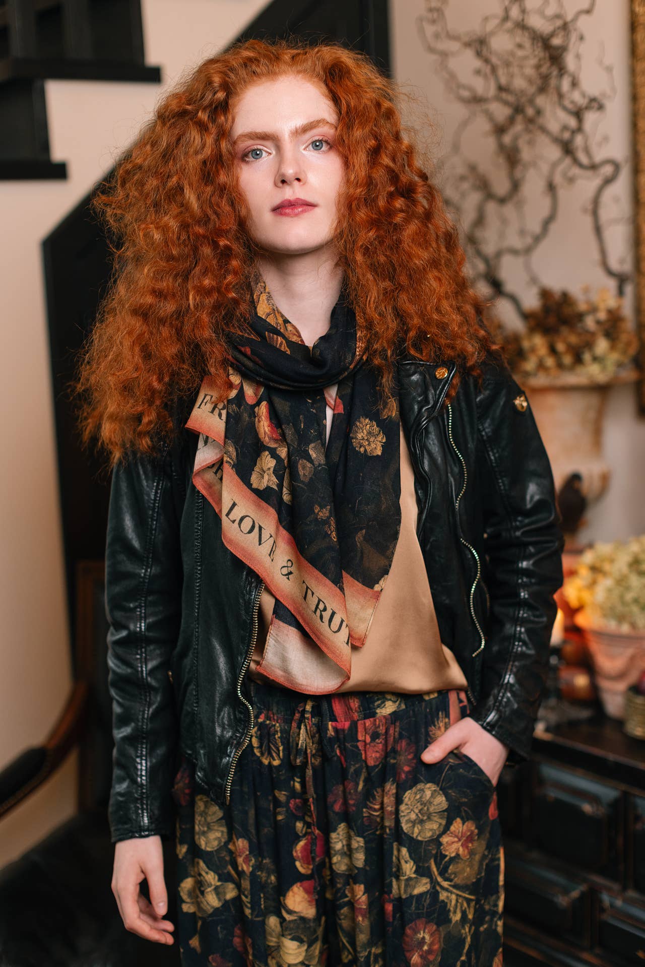 Introducing Heart of Gold — our beautiful & dramatic new collection that celebrates the bonds in our lives that endure. Designed using an intricate collage of antique artwork, it features hand-painted swallows from an 1865 scrapbook, floral wreaths done in the 1600s, and a sacred heart from Notre Dame in France, which was embroidered with gilded thread and completed in 1872. The two swallows with wings outstretched (traditional symbols of loyalty) carry a ribbon between them as a reminder that even across distances, those we love will always be a part of us. The vintage banner proudly displays the motto “friendship, love, and truth” -- a declaration of what truly matters. 100% viscose (derived from plant fibres such as wood and bamboo). Handwash, hang to dry. 68cm x 155cm. boho bohemian gypsy vintage antique garden nature spring fall clothing womens elegant botanical gift