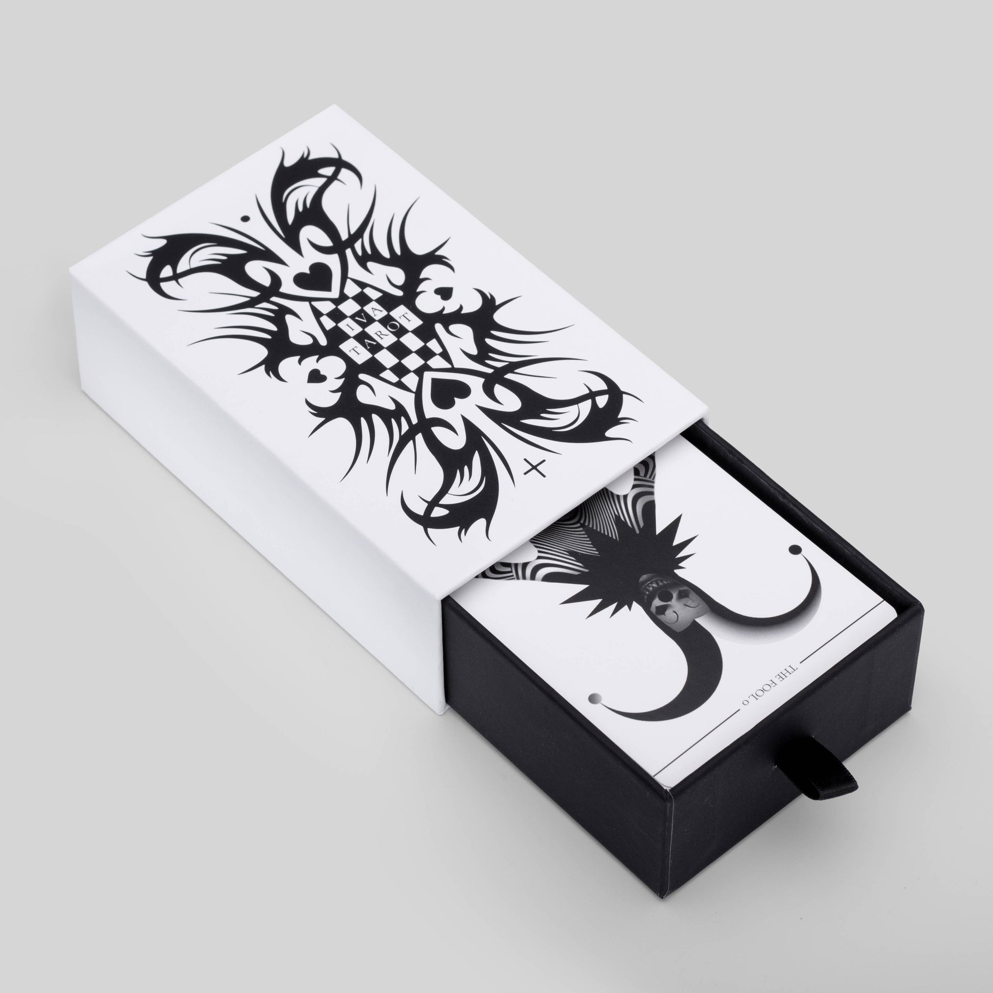 Latest release! (Feb, 2025.) Modern black and white tarot deck with abstract art. Slide-out box. Electronic booklet.
