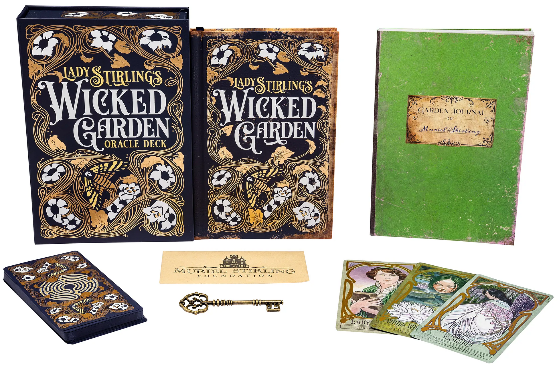 Strange occurrences plagued the Stirling family estate until Muriel Stirling discovered a mystical, wicked garden where she meets the garden's inhabitants and its caretaker, Faunus. Read the poignant story of Muriel Stirling's Wicked Garden in the 80-page, full-color illuminated hardcover novelette. Meet the magical creatures living in the garden, featured in the 32-card gold foil-accented oracle deck with indigo edges. The 80-page full-color journal guidebook invites you into meaningful conversations with each garden spirit—from the deadly nightshade Belladonna to the fragrant Angel’s Trumpet—offering gentle yet powerful reflections on nature, emotion, and the hidden patterns within our lives. Deluxe, collector-worthy set includes your own copy of the key to the garden.