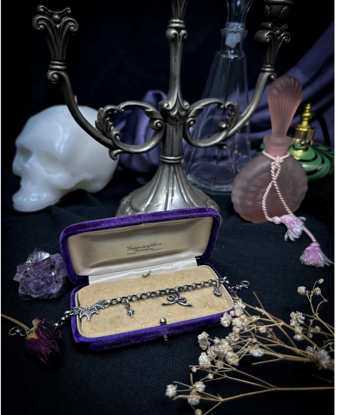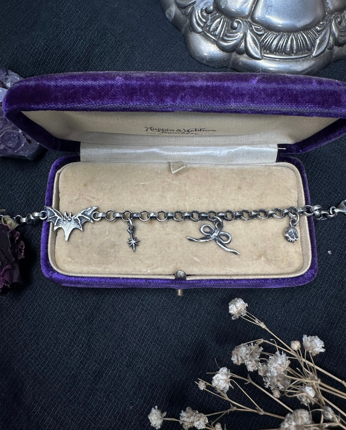 A collection of Olivia Faust’s most iconic motifs—bat, skull, bow, and star—brought together in a dreamy, gothic charm bracelet. Set on a chunky rolo chain, it’s the perfect statement piece, both dark and sweet !