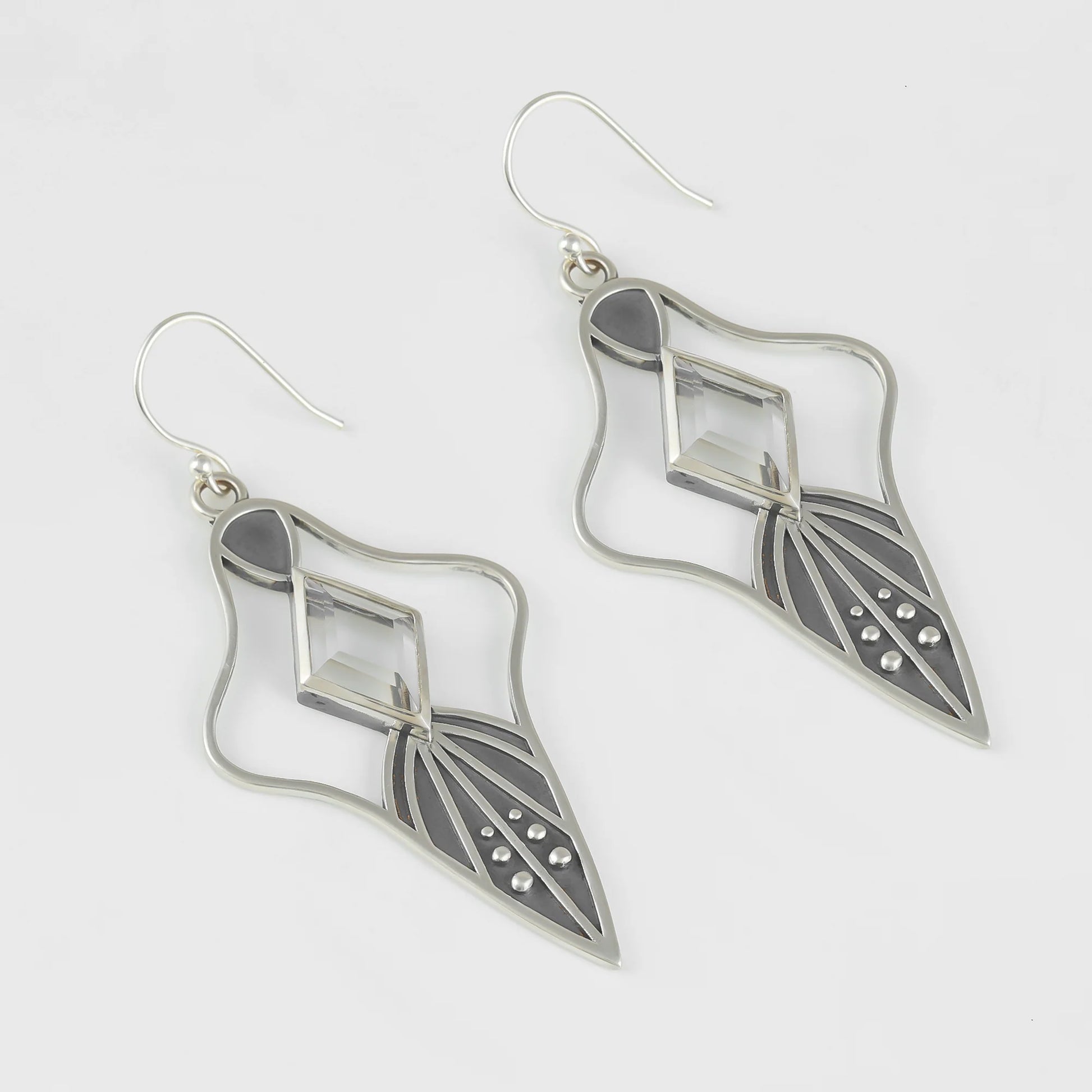 Hand carved and cast Crystal Caverns sterling silver Earrings FAN SHAPE, set with a natural Quartz. They have a handmade sterling silver ear hook. If you have questions regarding this pair of earrings, you can contact us at any time.