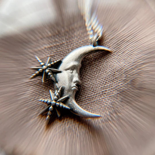 Introducing the enchanting Nightfall Necklace - a talisman that allows you to immerse yourself in a world of dreams and magick. Crafted with utmost care and attention to detail, this piece is available in your choice of timeless brass or solid .925 sterling silver (14K gold and 14K rose gold available upon request). You may also choose the size and style of chain, CZ crystal or none. These moons are double sided with 2 stars on the front of each moon.