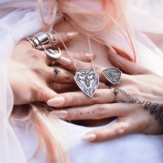 Transform into an ethereal beauty with the Shield of Ilmarë Necklace. Inspired by whimsical elven designs (crafted in the Lord of the Rings works by Tolkien) and art nouveau detailing, this exquisitely detailed handmade piece exudes a sense of otherworldly elegance. Allow yourself to be enveloped in a world of fantasy, beauty and enchantment...