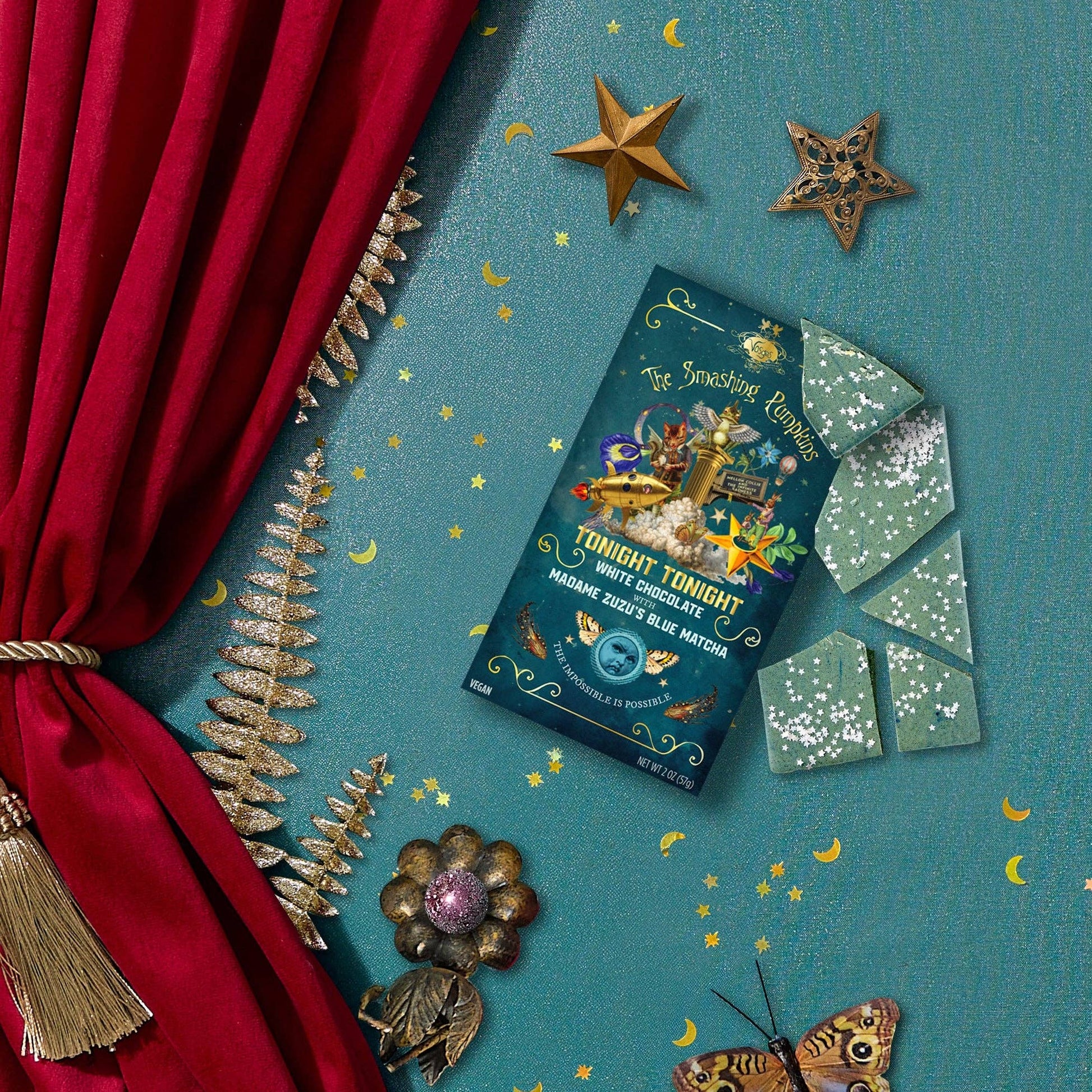 Experience the magic of Tonight, Tonight — a celestial vegan white chocolate bar inspired by the iconic Smashing Pumpkins track. Velvety vegan white chocolate is infused with Madame ZuZu’s Electric Blue Matcha, vibrant spirulina, and a whisper of lime zest, creating a luminous, ethereal flavor. Earthy matcha melds with creamy white chocolate, while bright bursts of lime shimmer like stardust on the palate. Each bite is a whimsical symphony of taste, evoking a dreamy, melodic journey that celebrates music, artistry, and chocolate in perfect harmony.