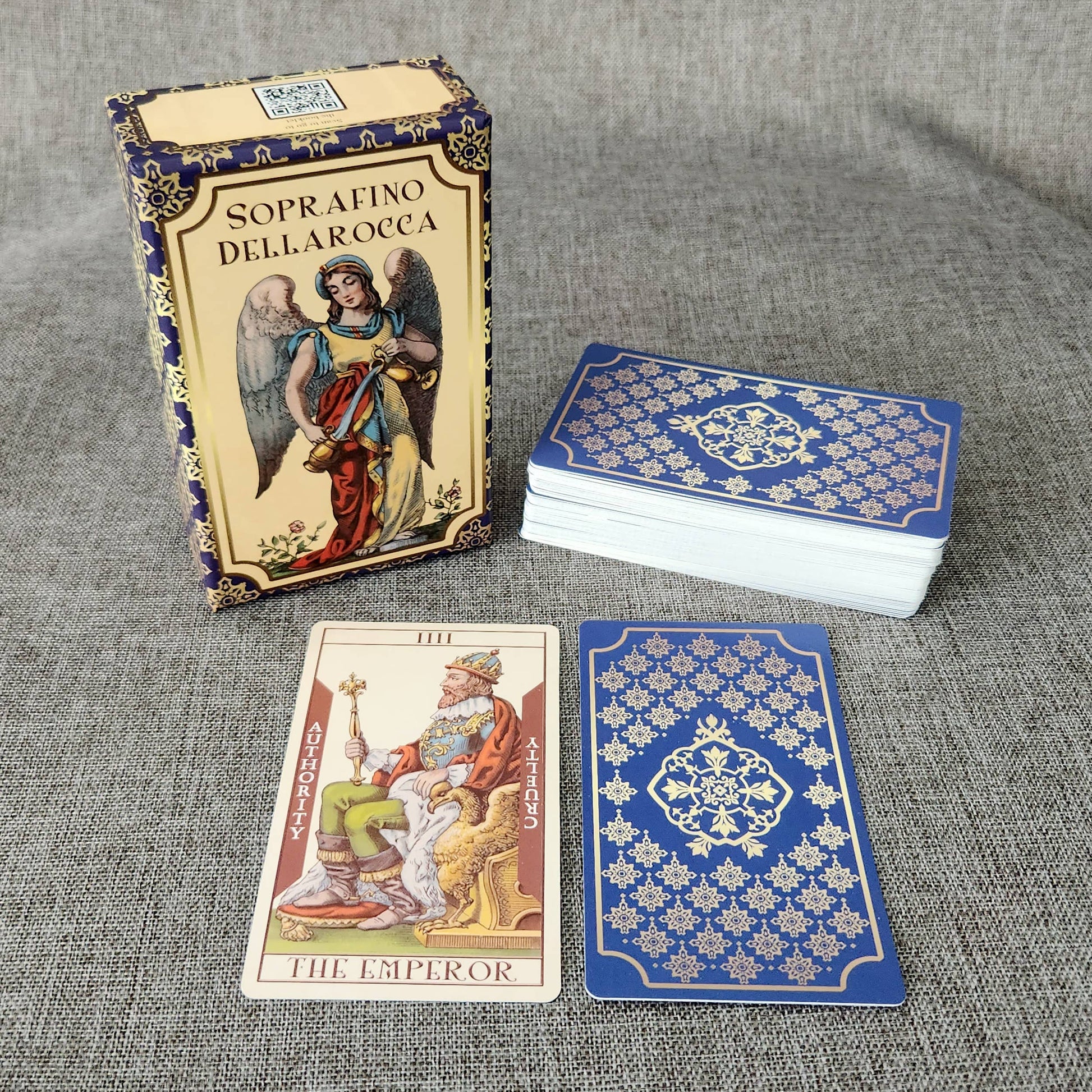 Our remake of the historical “Soprafino Dellarocca” tarot deck originally designed in 1835. Card meanings printed on the cards. Sturdy top and bottom box.