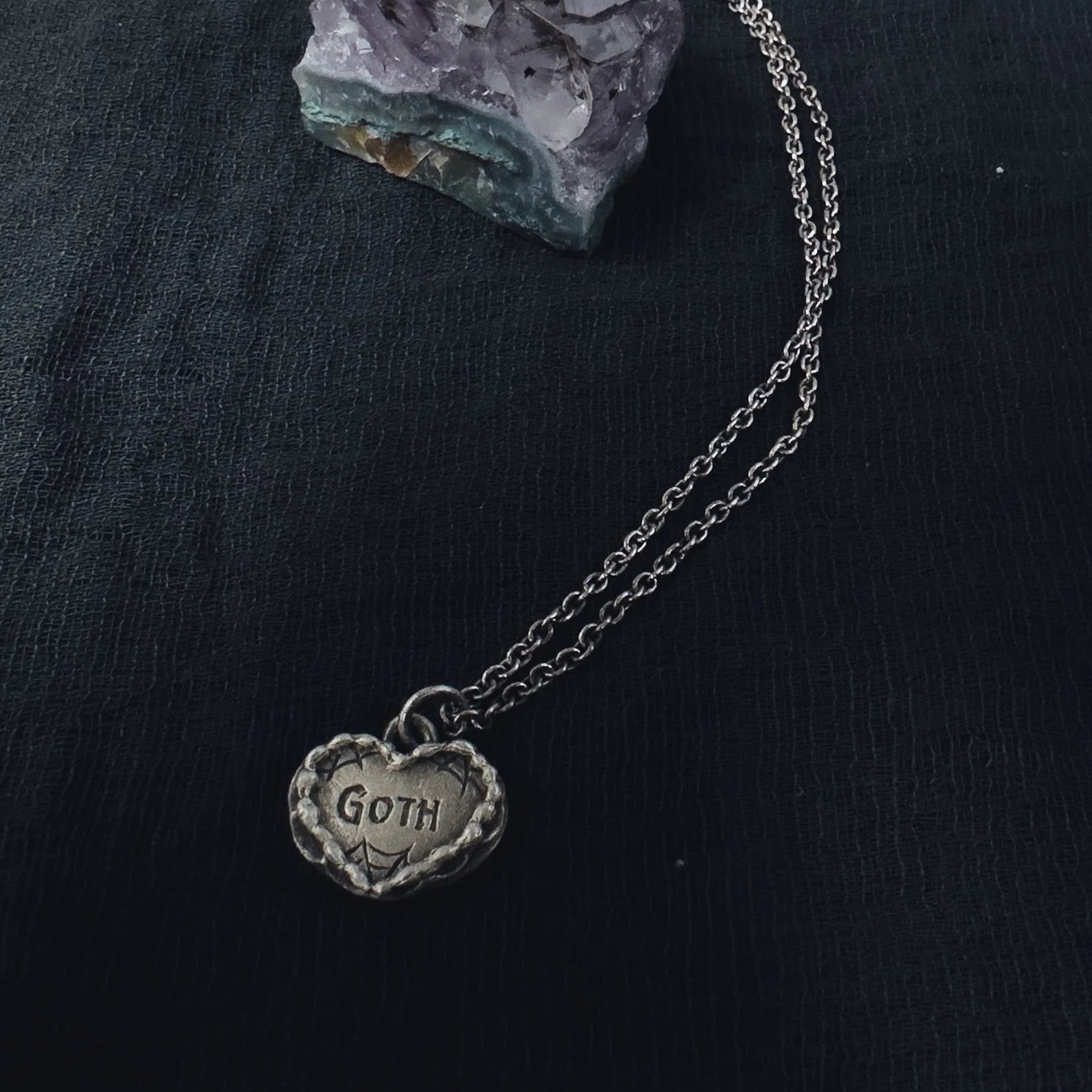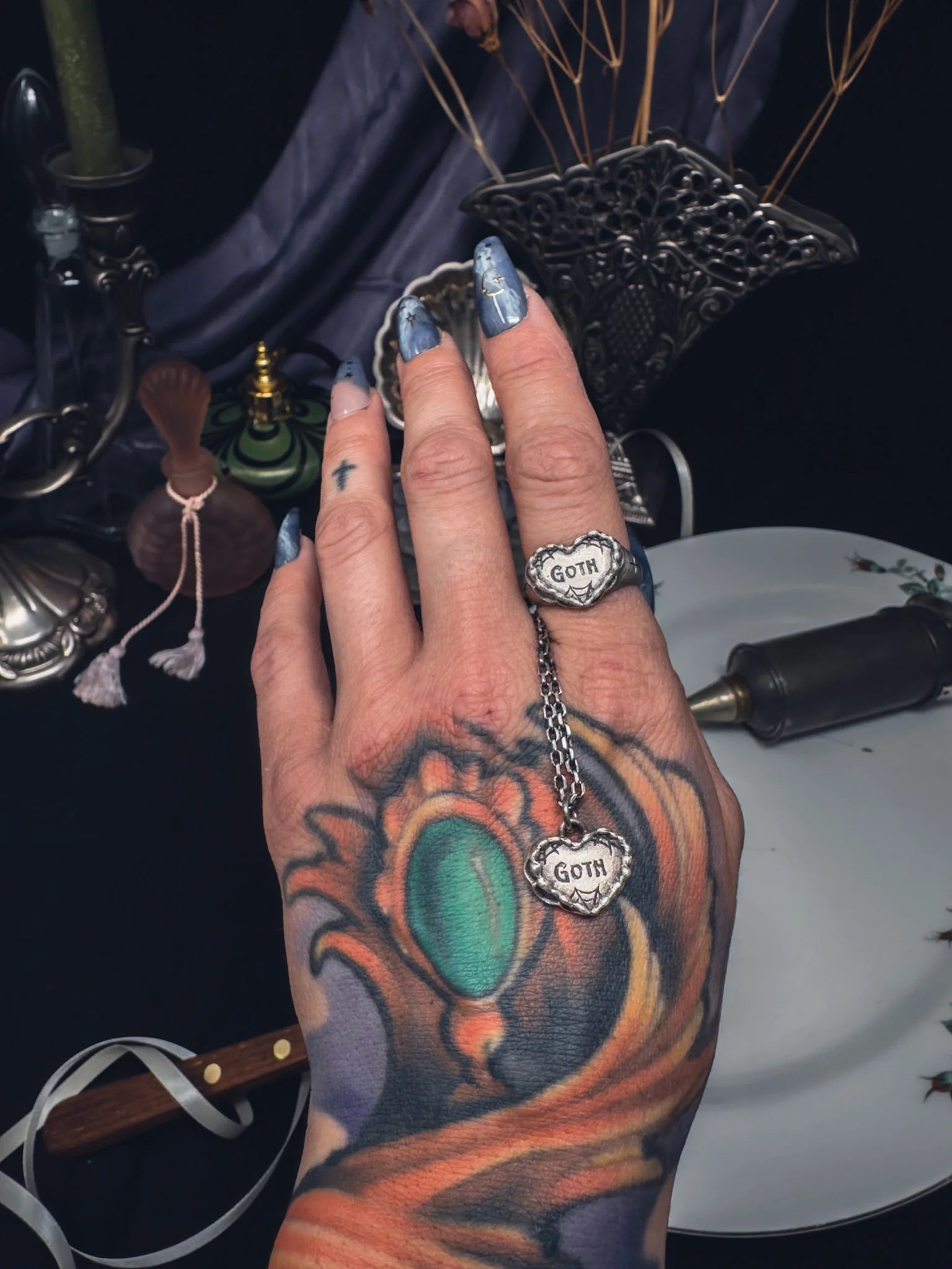 A heart-shaped mini cake, adorned with delicate icing details, a gothic inscription, and spiderweb accents. Inspired by Olivia Faust‘s infamous Sugar Goth Cake, it's the sweetest way to add a little darkness to your jewelry collection.