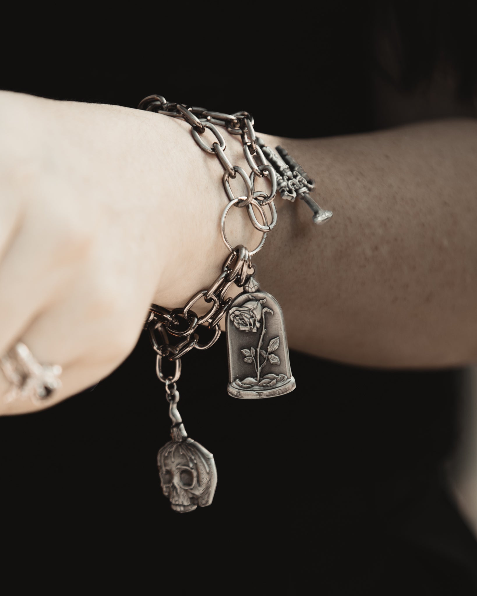 When you clasp the Saint’s Shadow around your wrist, you carry the stillness of candlelight and the weight of centuries old secrets. The delicate chain glimmers like thought itself quiet, introspective, and enduring. It’s made for those who wander ivy-covered courtyards, linger in dusty libraries, and find beauty in silence.