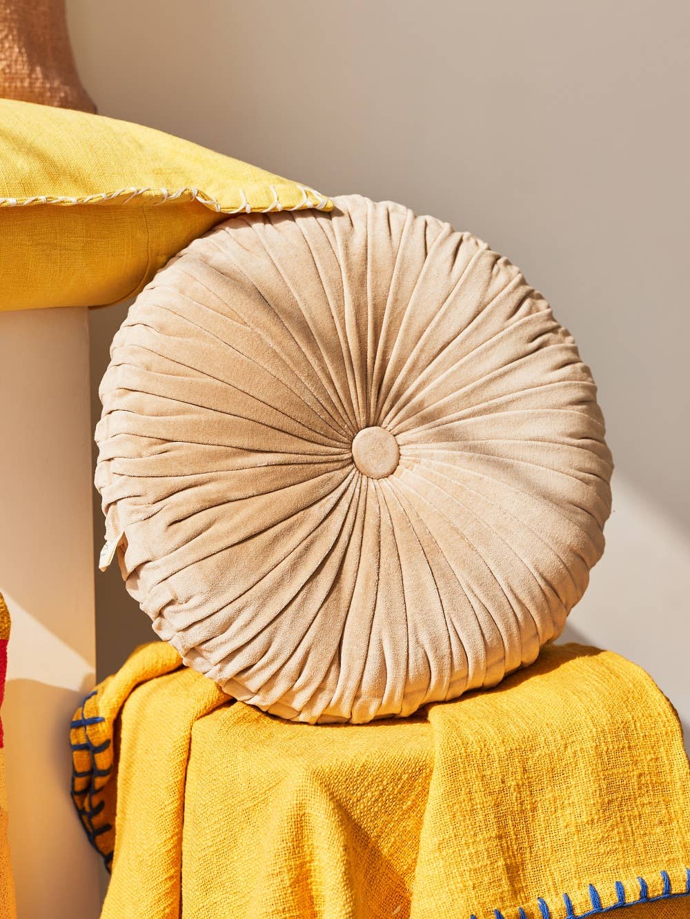 The hand-stitched decorative pleats add a touch of elegance and texture to the pillow, while the cotton velvet construction ensures durability and comfort. Don't miss out on this must-have item for your stylish home. Shop now and elevate your home decor game with the Velvet Round Handmade Pillow Biscotti - 16 Inch.